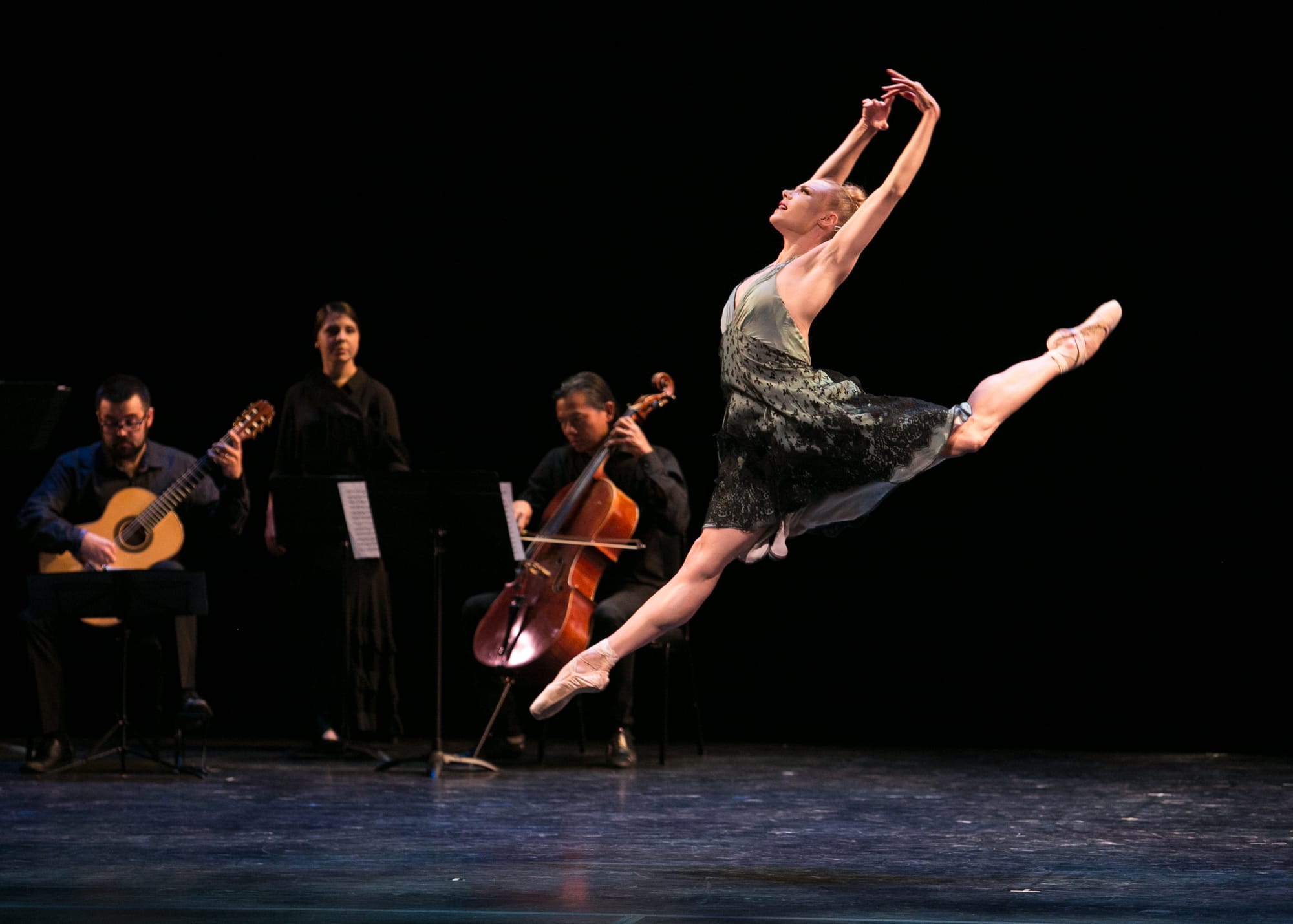 Sara Mearns, the fierce, forceful, and compelling NYCB dancer, also got a solo, Alexei Ratmansky's Boccherini-inspired "Fandango". It honored both the dancer and the on-stage musicians (the Flux Quartet augmented by a guitar and castanets). Mearns sauntered on, pausing to listen and nod to the musicians before bursting into a seemingly impromptu dance that exalted freedom, felinity, and the most eloquent back since Virginia Zucchi captivated Russia. She seemed to be performing the dance that Robbins' Woman in Green was remembering.