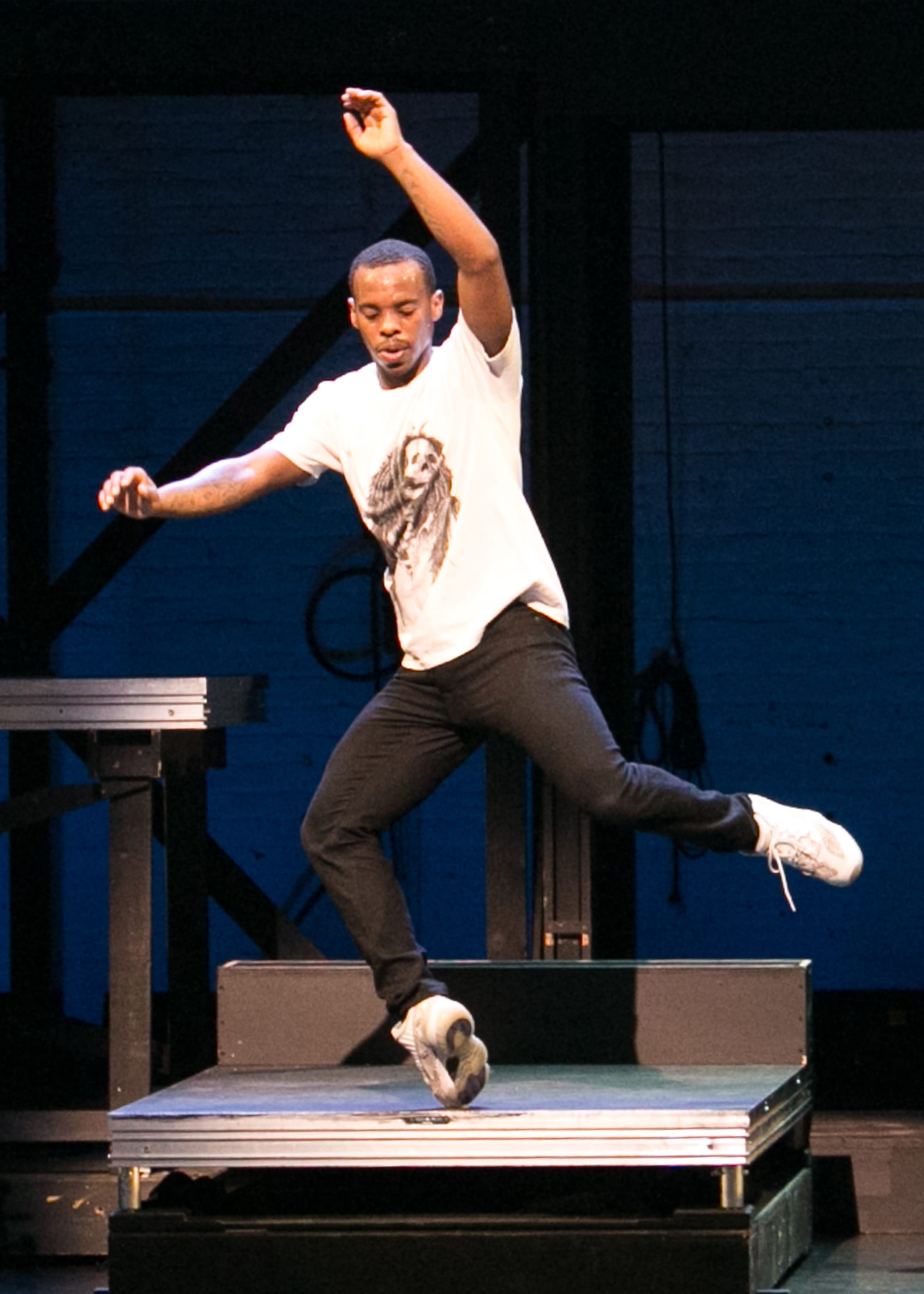 I saw the black ones, which I think work best for this version, giving Apollo weight and a bit of grit -- this Apollo was not a perfect marble statue. Soccer, dancing on hot coals, and Piccadilly Circus at night are the metaphors often used to describe the action, and Fairchild captured the more human demi–caractère feel. He was especially compelling in the final call to Olympus, as he responded with a slightly uneasy look, as if he weren't sure he was ready to put away childish things, then growing steadily more secure as he climbed the stair.