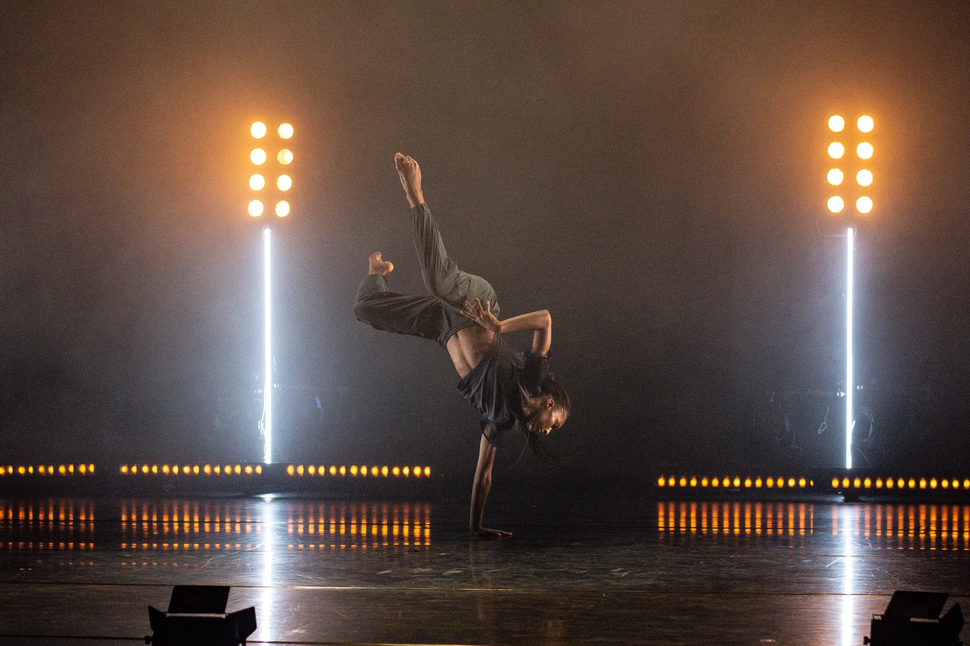A far more frenetic version of his vocabulary, this time with the addition of acrobatic moves like cartwheels and hand stands, was to be had in the final dance, “Drive.” The work includes a phenomenal lighting design by Dan Scully that started with a band of red lights glittering across the back of the stage, visible through dense fog and darkness, like airport runway lights in bad weather. Within this miasma, a dancer is glimpsed flinging himself into tumbling moves. Soon the fog clears enough to see the entire company of eight (Baker, Guy, Jinakunwiphat, Johnson, Kirk, Lewis, Donovan Reed and Jada Jenai Williams) dancing their hearts out, as the lights shift to diagonals of blue, towers of white, then back to bands of red, the stage now in near darkness, now alight, and as hip hop sound and lyrics blare from hidden speakers. But this is Abraham, so as much as energy is on display, so is control. And the work ends with no sense of frenzy.