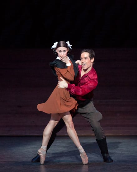 The other supporting roles, though, as has been the case in every cast I have seen, were vivid, brilliantly characterized, and wonderfully danced. How Ratmansky loves his characters, from the garrulous inspector of quality (Alexei Agoudine), with his rollicking pride to the little school girl (Sarah Lane), with her frisky charm. Christine Shevchenko looked lovely in her red dress, and milked a mean cow. Sascha Radetsky was the Accordion Player, a man who apparently watched Rudolph Valentino in "The Four Horsemen of the Apocalypse" with the same devotion that Woody Allen gave to "Casablanca". He was utterly deflated when he realized he was being made fun of (his rival, the Tractor Driver, was dressed up as a dog and chased him away before jumping up and tangoing the heck out of the music), but was able to laugh at himself and join the fun. Radetsky gave this moment a light-hearted dignity that gently underlined the ultimate truth supporting this wonderful ballet--learn to laugh at yourself and people will forgive your faults.