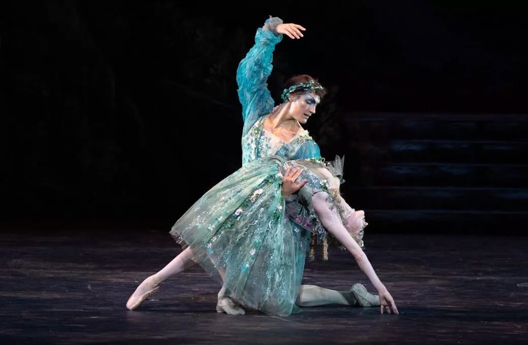 ABT’s “Ballet Imperial”, familiar to New York audiences as NYCB’s “Tschaikovsky Piano Concerto No. 2”, uses scenery and costumes based on the original Rouben Ter-Arutunian designs for the 1964 NYCB revival of the 1941 ballet when it was still Imperial (the glimpse of old Russia in the background and the elaborate tutus were replaced in 1973 by a plain backdrop and chiffon shifts). 1964 was also the 400th anniversary of Shakespeare’s birth, and the great British choreographer helped celebrate it with his version of “A Midsummer Night’s Dream”, a one-act condensation set to Mendelssohn’s 1842 incidental music composed for the play. Ashton’s ballet often looks back to the Romantic ballet of the period, with delicate footwork, tilted torsos—four fairies even give us a glimpse of the famous “Pas de Quatre” pose. But Balanchine and Ashton were not choreographing simple pastiches, and both ballets have a timeless beauty, with choreography rooted in the past but always fresh.