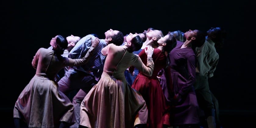 Limón's "The Unsung" from 1970 is a memorial to Native Americans; the only sounds were rhythmic stomping and the sharp intake of breath by the seven male dancers (Tanner Myles Huseman, Malik Williams, Jesse Obremski, Alex McBride, Terrence D. M. Diable, David Glista, and Mark Willis). The program gave the dancers names of Native American chiefs, though there was nothing literal about the choreography, which evoked rather than imitated Native American styles. The outstretched fingers framing their heads could represent feathers or the horns of the animals they hunted, but they also seemed to indicate power and grace.