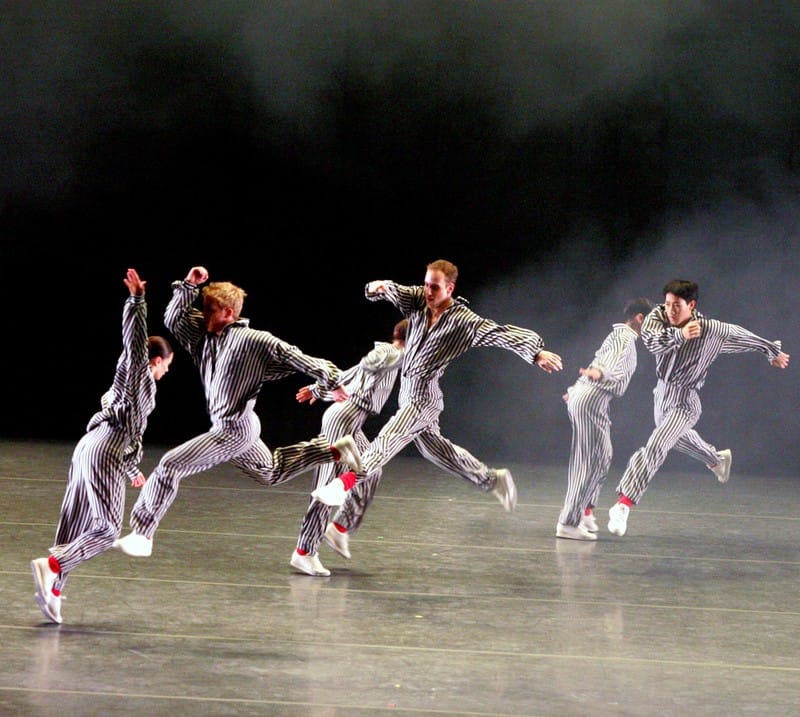Gasping seemed in order for the final dance, Twyla Tharp's "In the Upper Room". It is a crowd-pleasing finale, but I find the Philip Glass music a bit one-dimensional and repetitive (I know, that is the point), and the choreography, with its non-stop, frenetic energy, doesn't build. It certainly has some striking images, from the smoke-filled stage, with the dancers emerging mysteriously into view, to the black and white, prison-stripped pajamas with their red accents, but there doesn't seem much more to watch than the constantly changing shapes and quirky physicality of the dancers. That was certainly enough for the audience, and the dancers seemed to be having a wonderful time.