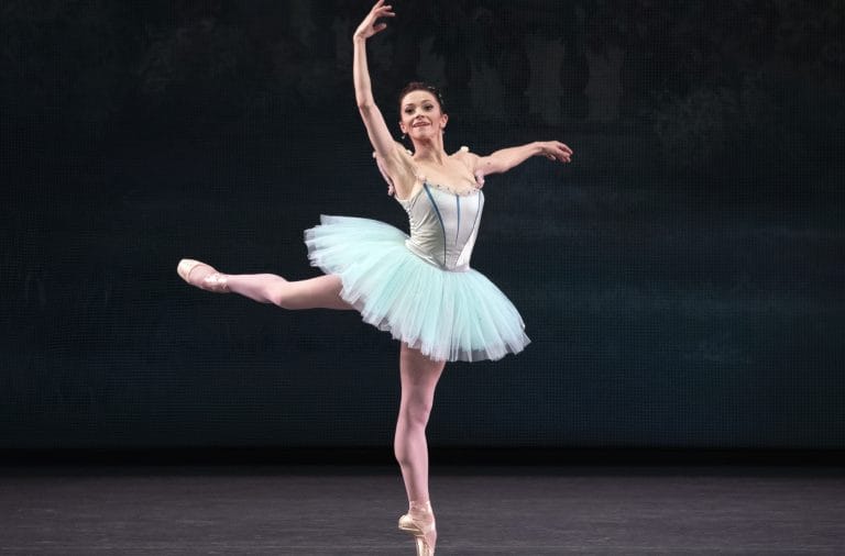 There was a lot of movement in “Raymonda Variations”, with a regal and energetic couple (Megan Fairchild and Anthony Huxley), five soloists (Allegra Inch, Mia Williams, Meaghan Dutton O’Hara, Mary Thomas MacKinnon, and Kloe Walker—Inch, Williams, and Walker in their debuts), and an energetic all-female corps. The ballet is predominantly pink (the principals wear turquoise), and, surrounded by Galzounov’s rich melodies, feels like a luxurious box of candy come to life.