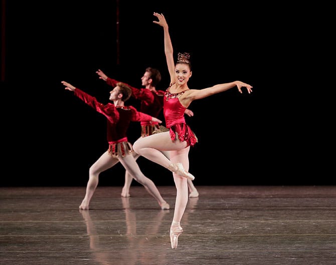 After the red hot “Rubies”, “Diamonds” was a cool drink of water, clear but unfortunately a bit bland. Unity Phelan is without a doubt one of NYCB’s great beauties, with a movie star face, a perfect ballet body and easy extensions, but at times she can be a bit careful, and “Diamonds”, so redolent of Suzanne Farrell, can’t be careful. Nor can it be anonymous—there is something going on in the pas de deux, though it may vary from couple to couple and even from performance to performance. Phelan’s serene perfection certainly had its beauties but they weren’t “Diamond’s” beauties, and she seemed to move from one perfect pose to another with little dramatic impetus.