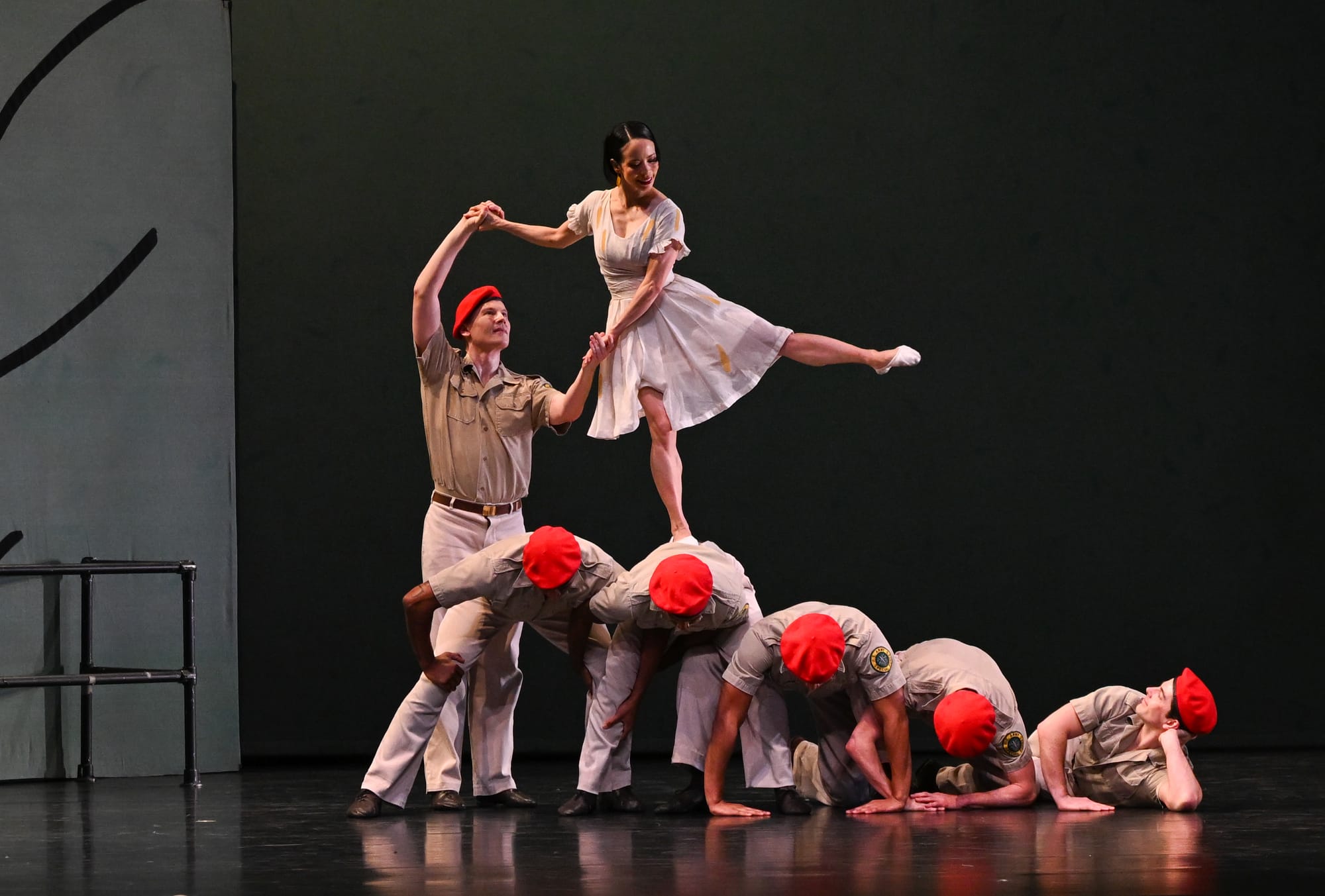 Taylor used a combination of Edward Elgar and loon calls to create a haunting vignette of four girls in white summer dresses and six soldiers in Alex Katz’s abstract park as they danced and flirted with a lilting innocence before the men go off to war in some unnamed location (the loon sounds evoked a jungle atmosphere). The girls emerged as angelic comforters, nursing the fallen soldiers, then, returning to Elgar, they were back in the park, the girls watching the soldiers leave as a red beret falls to the ground, a reminder of the dead soldier. Taylor’s solemn restraint avoided any sentimentality.