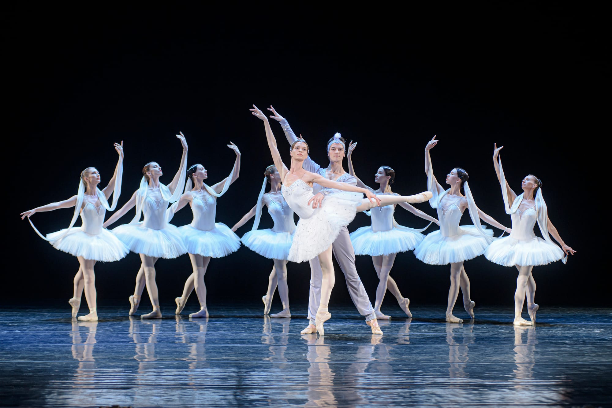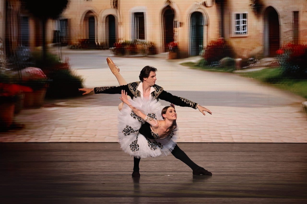 In addition to the more familiar pas de deux, the company danced some recent works by Ukrainian choreographers. The program opened with “Melody in A Minor” by Mykyta Sukhorukov, a current dancer with the company, set to music by Myroslav Skoryk, a Ukrainian composer (the company does not currently perform any pieces set to Russian composers). The dancers, Olga Golytsia and Sukhorukov himself, wore folk-inspired costumes and it was danced in front of a backdrop of a village scene. It was a lyrical reverie full of soft lifts, an eloquently dance gentle depiction of young love.