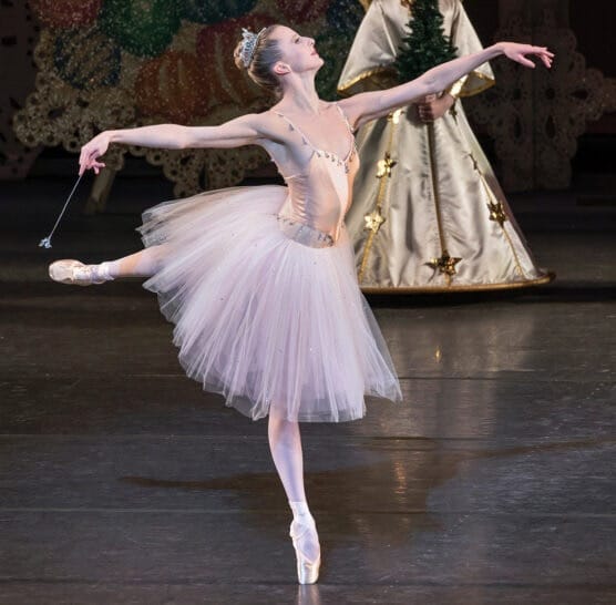 Daniel Ulbricht led the Candy Canes with a similar clarity and concentrated energy and his fifth positions seemed snapped into place by magnates. His power and precision, along with his fearless double twirls of his hoop, made it difficult to realize that he has been with the company for over twenty years. Sara Adams was an elegant if slightly careful Marzipan Shepherdess, and her smooth upper body made a vibrant contrast to her fast footwork. Alex Knight danced with a glorious flourish and gave Hot Chocolate an unusual dynamism.