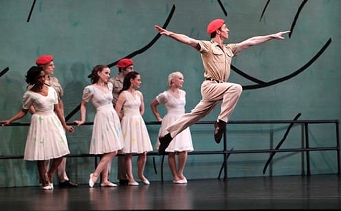 Mahoney was also in "Sunset", Taylor's haunting salute to comradeship in wartime. He and Robert Kleinendorst danced together and in a subtle examination of friendship, Taylor transformed inarticulate hesitation into poetry. With its shyly flirtatious woman and eager, awkward men, "Sunset" does echo the world of "Fancy Free" (Alex Clayton even gets a thrilling show off solo). But it follows them to war, as the elegiac Elgar music changes into a recording of loon calls, which somehow creates a quiet, dangerous jungle.
