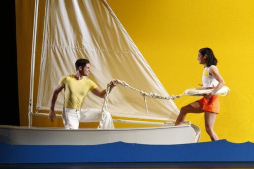 The new "Sea Lark", set to selections from Francis Poulenc's "Les Biches", is not about birds (though the dancers are lighter than air); the larks are lighthearted romps set on the seaside. The ten dancers, dressed in cropped playsuits for the women and white bell bottoms with colorful tea shirts for the men, inhabit a land of eternal youth without the shadows the younger Taylor often found. Nor is there any echo of the ambiguous, uneasy undercurrent of the Nijinska choreography; this is a sunny landscape where the sea is calm, the sky is blue, and the boat never rocks. It is a light piece, pure joy and a fine antidote for a miserable winter. The dancers seemed to enjoy the sweet-natured innocence of the choreography, which ended with the cast marching with a nautical swagger as individuals broke from the group to show off a series of gymnastic gyrations.