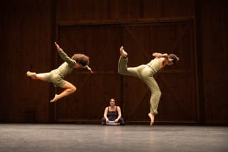 “Para” as a prefix has a variety of meanings, from beside and beyond to ancillary and extra, which is a good indication of the breadth of “Paramodernities.” Each of the six sections is an independent entity, yet there are elements that connect them. To begin with, in each instance Yerushalmy invited an academic or writer to contribute an essay, which he or she reads on stage, while dancers perform choreography Yerushalmy has created based on movement drawn from a work by one of the six choreographers. For example, in the Graham section (“Paramodernities #2) art historian Carol Ockman read her text while Yerushalmy and Taryn Griggs performed Yerushalmy’s dances, which used vocabulary from Graham’s “Night Journey,”