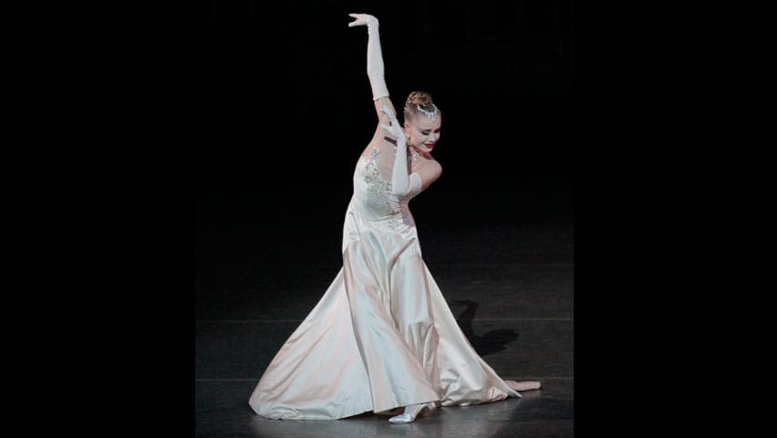 Erica Pereira and Troy Schumacher were properly perky in the "Explosions Polka", though this vignette does suffer from a surfeit of cuteness. There was nothing cute about Rebecca Krohn and Chase Finlay's Merry Widow waltz (or to give it its proper name the "Gold und Silver Walzer). His open-faced innocence and her black widow sophistication were a departure from the traditional take (older man meets lonely widow and they waltz happily), but their contrast created a compelling drama. Krohn eyed him like a spider looking at a particularly appealing fly and it seemed as if the poor Prodigal had left his farm to meet the Siren in the Parisian demimonde.