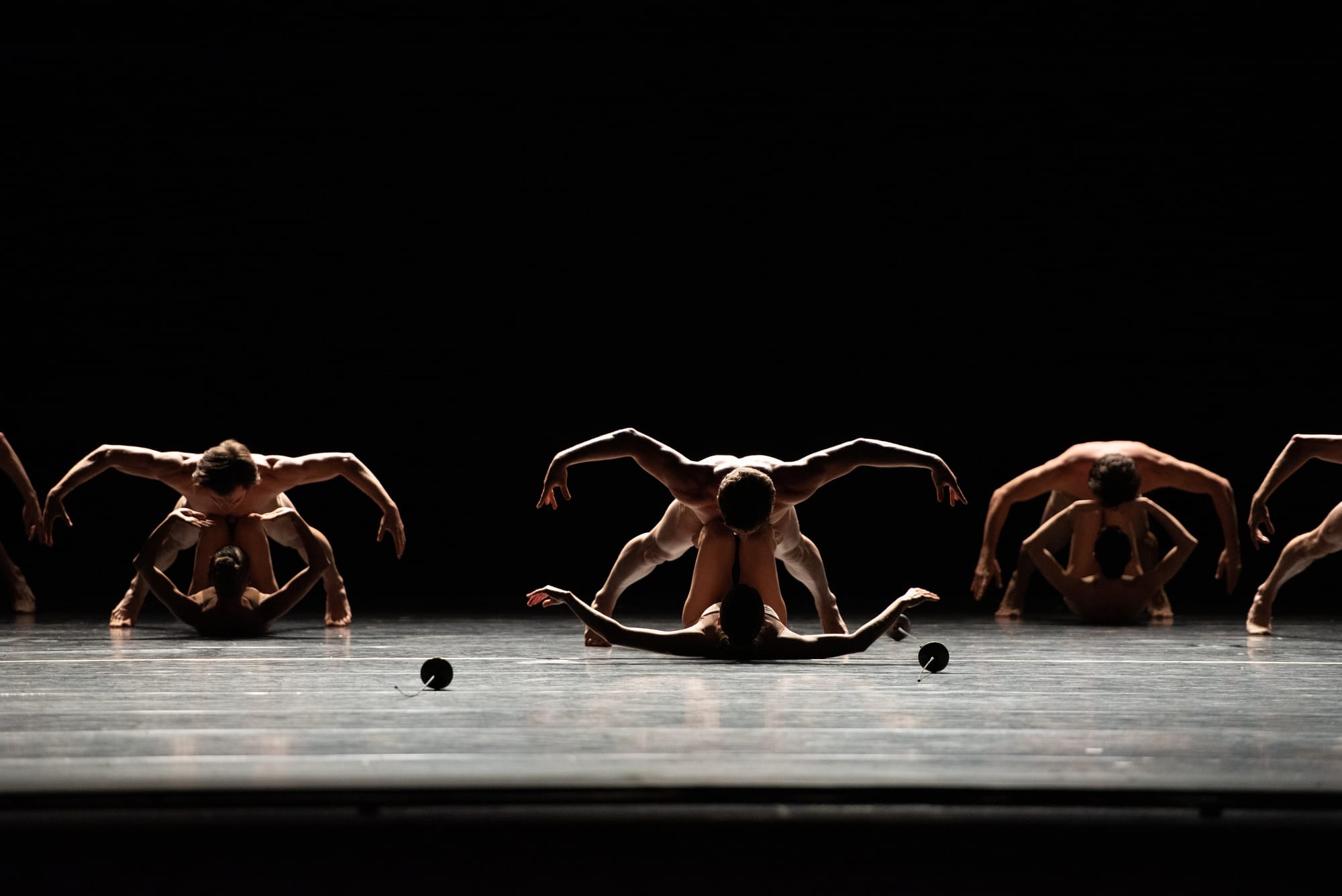 The program also included the company premiere of Kylián's sexually charged "Petite Mort", created in 1991 for the Salzburg Festival. Set to the adagios of two of Mozart's piano concertos, the ballet blends formal, ceremonial elements with naturalistic movement. The ballet is created for six men and six women who dance together and separately with props. The men dance with fencing foils, symbols of male potency and domination. However, they do not simply whip the foils around aggressively. They maneuver the foils around their bodies and on the ground with respect and delicacy. The women dance with large black period dresses on wheels that glide across the stage. Perhaps similar to the foils, the dress is their tool of defense. In a trompe l'oeil effect, it initially appears as though the women are wearing the dresses until they take a step sideways to show they are simply standing behind them. The dancers pair up in various tense pas de deux involving a lot of floor work and power struggles. All were very strong, especially Tina Pereira and Spencer Hack. Pereira's tremendous flexibility creates an extravagant line, while Hack was an athletic and steady partner.