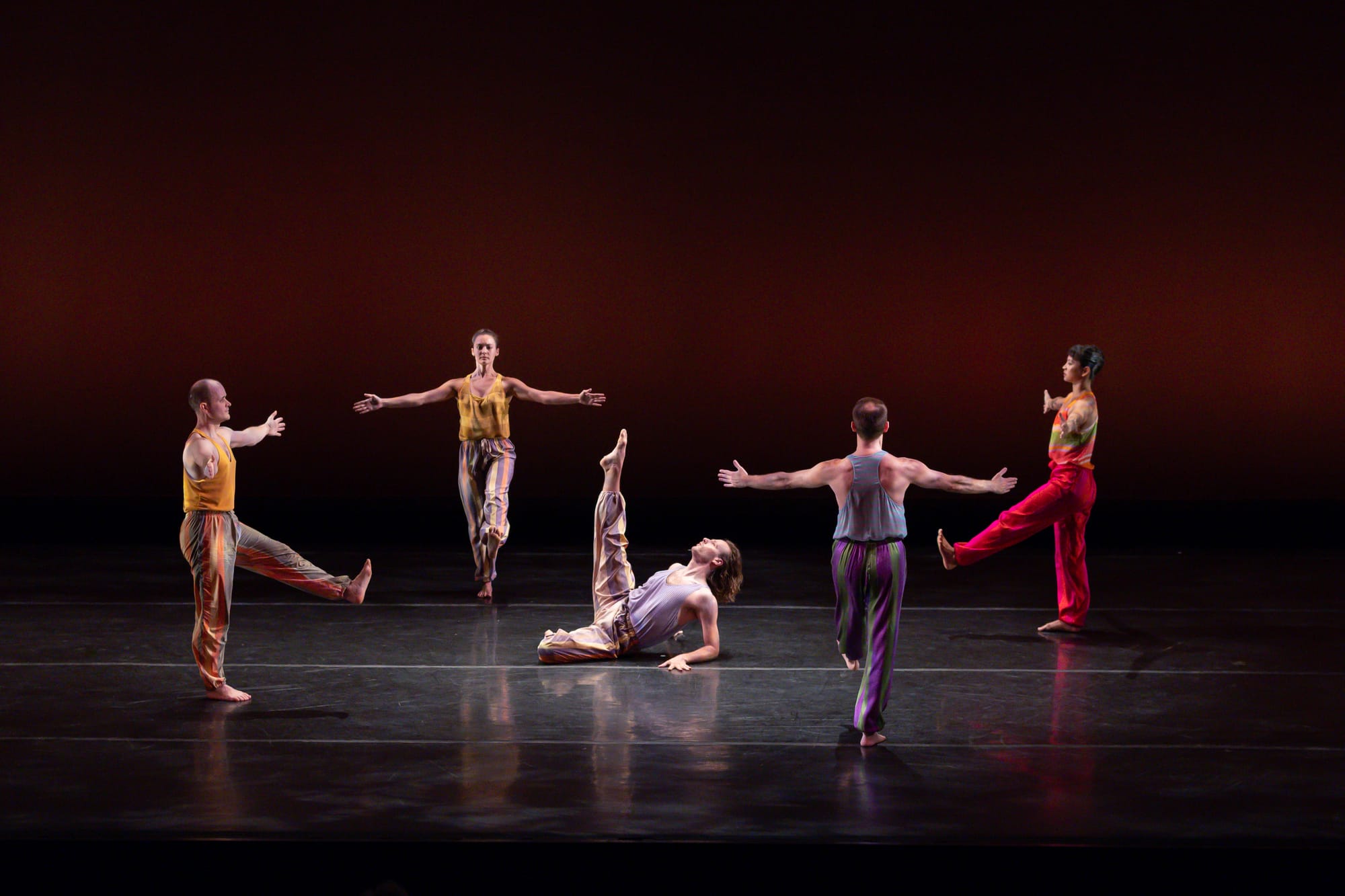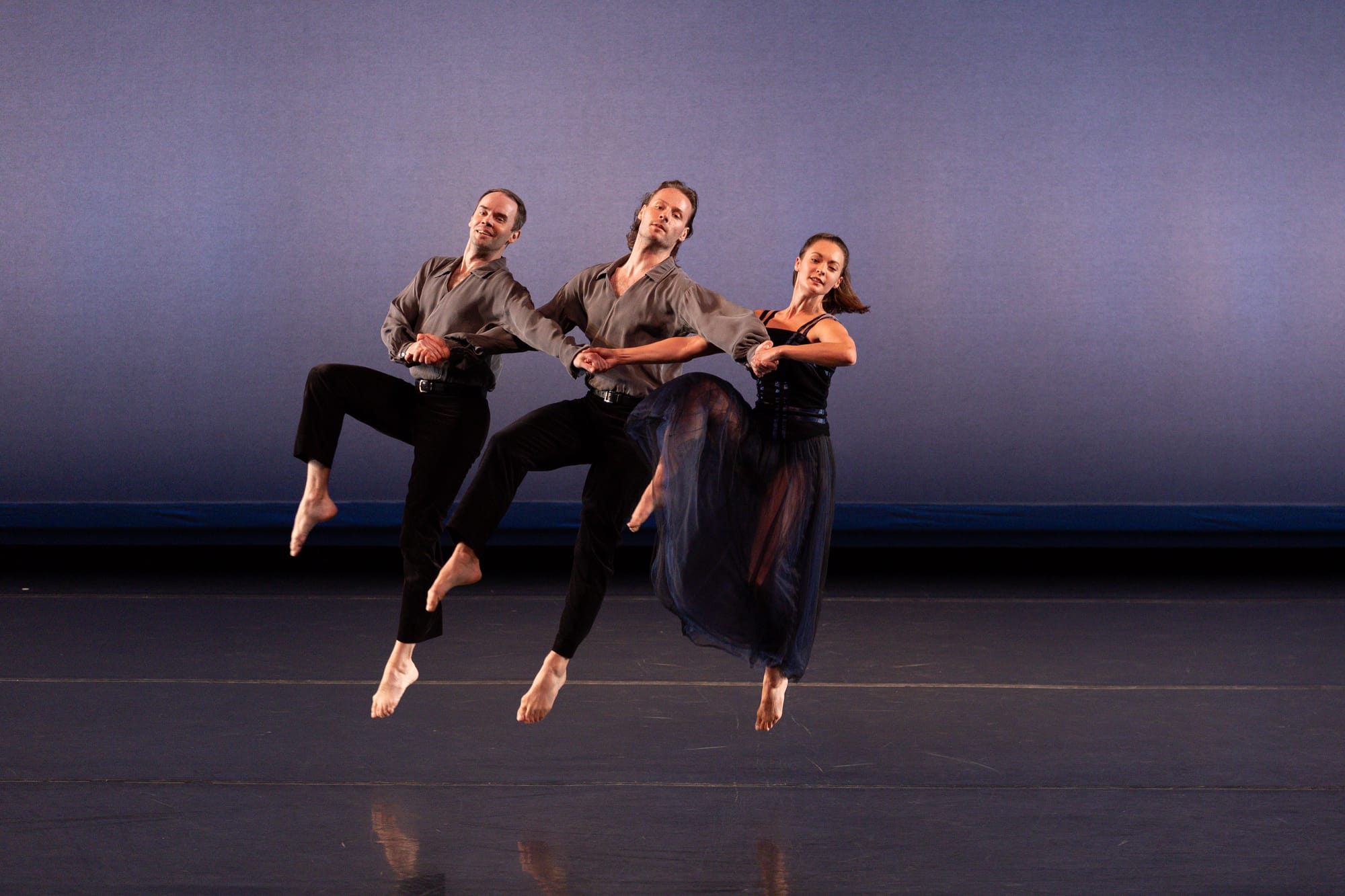 Program A opened with “The Muir” (a Scottish word meaning moor), a 2010 work set to Scottish and Irish folksongs arranged by Beethoven; these were sung live by Chloe Holgate, Chad Kranak and Julian Morris, accompanied by a violin, cello, and piano. The six dancers, three women and three men, roamed through the various moods, happy, mysterious, funny, and tragic. The program included the words of the folk songs but there were few hints of a narrative. There were brief hints of sylphide arms (so appropriate for Scotland) by the three women, though they were anything but sylph-like—Morris’s women can stand on their own. So too can the men (Dallas McMurray, Billy Smith, and Noah Vinson). I particularly enjoyed McMurray’s preening to “Sally in Our Alley”, as he dressed up to go dancing. The dancers dug into the rhythms with small prancing steps and odd, quirky gestures that seemed to have a logic and a beauty beyond meaning, ending with the haunting vignette of a woman alone mourning her dead. This was not a folksy visit to Brigadoon.