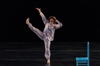 Mark Morris was the original dancer in “Ten Suggestions” (1981), a quirky solo to Alexander Tcherepnin’s “Bagatelles”. (The composer was the son of Nicolai Tcherepnin, who was associated with the Diaghilev company, so it seems appropriate that his music is so danceable.) Dallas McMurray, wearing flowing pajamas, wandered on stage, where he encountered a chair, a hula hoop, a hat, and a ribbon. With his hangdog look and limp, floppy somersaults, he resembled a silent film comedian exploring physical comedy with a childish glee that was both comic and touchingly innocent.