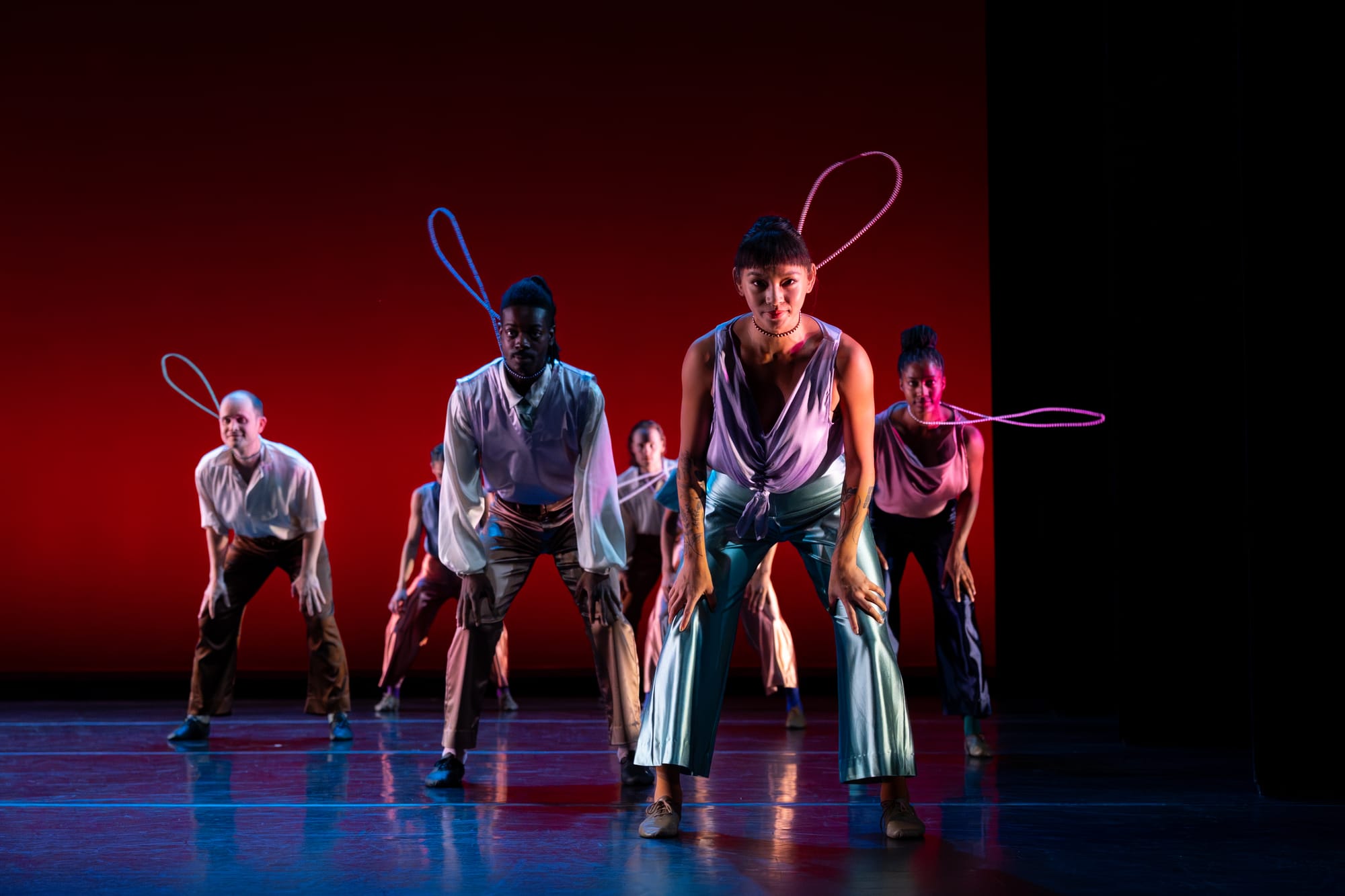 “Northwest”, in Program B, was a lyrical evocation of traditional Alaskan dances highlighting the little paper fans that the ten dancers fluttered throughout the piece. The delicate music, played on a harp and small drum, had a hypnotic rhythm echoed by the light barefoot swishings of the dancers. They were dressed casually in muddy green shorts and tee shirts designed by Amy Page, which merged into the background so the elegant lighting (Mike Faba) made the fans sparkle and the dancers looked like magnificent fireflies. They wove in and out, forming lines, circles, and groups in constantly shifting patterns that seemed timeless.