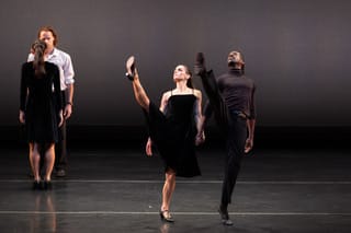Program B opened with “The Argument”, from 1999; it was set to Robert Schumann’s “Fünf Stücke im Volkston”, played by Colin Fowler, piano, and Andrew Janss, cello. Four couples in chic black (costumes by Elizabeth Kurtzman) with minimal, telling gestures (how powerful a snapped head or a turned shoulder can be) live through troubled relationships, variously angry, proud, unhappy, or resigned. There are no resolutions, no final breaks or rapturous reconciliations, just a feeling that life will go on.