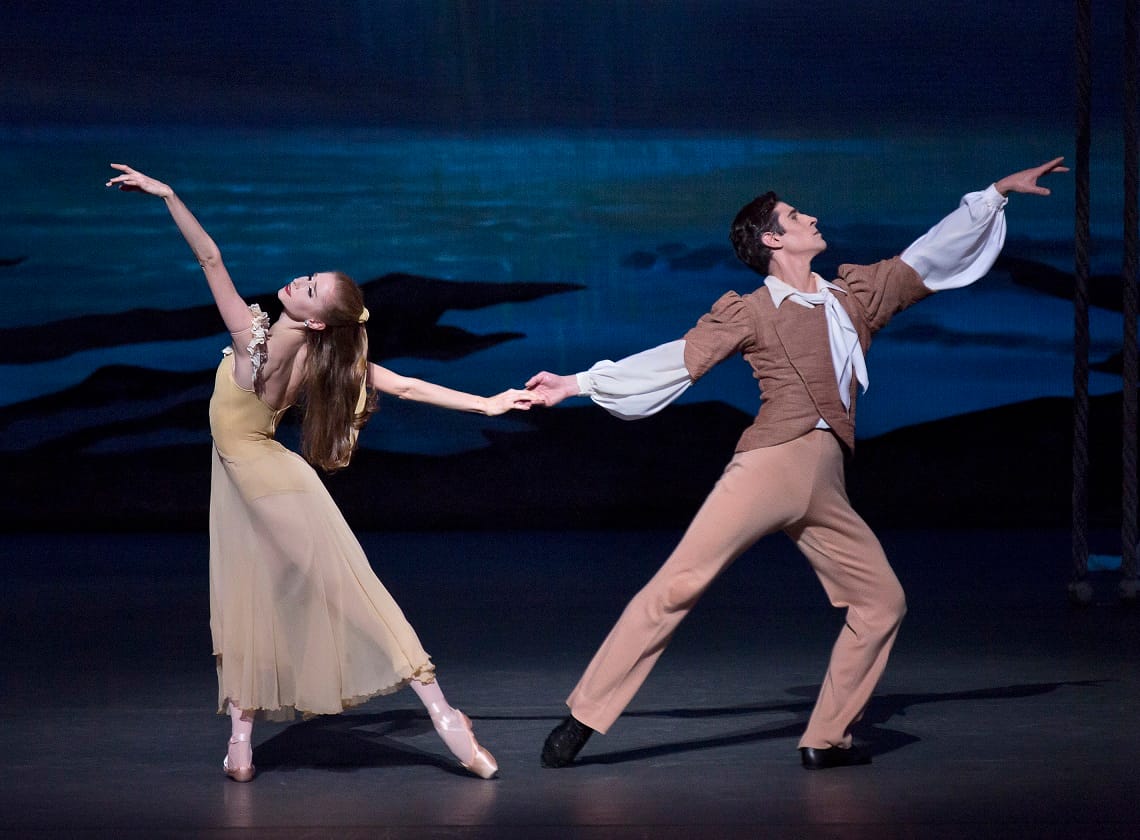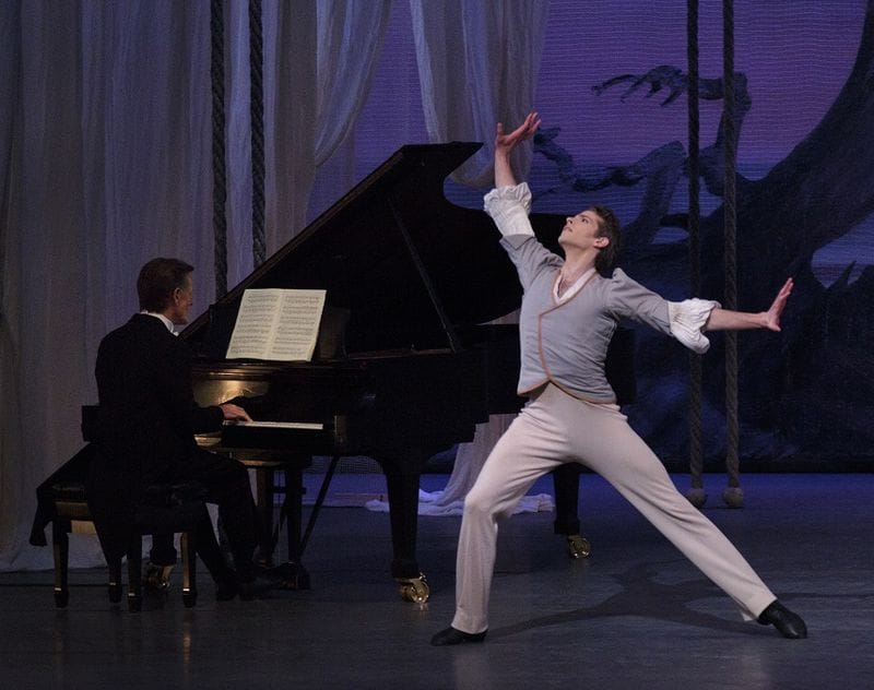 Reichlin and Janzen were clear in both their dancing and their characterization, but as yet, weren’t able to lay open their emotions—this was a demonstration of suffering rather than a recreation, and I missed the raw nerve atmosphere of some earlier couples. Janzen seemed a bit too normal for all the isolation and pain that Adam Lüders seemed to ooze, though he didn’t compensate by overacting, and his slight reticence had its own subtle power. Reichlin, too, is a cool dancer, and the emotions don’t pour out of her—the final scene, as she reaches for Schumann retreating into madness was eloquently posed, fingers just so, rather than a seemingly spontaneous cry.