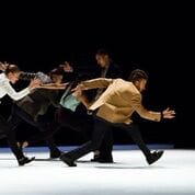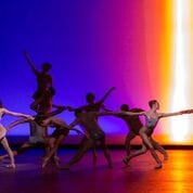 "Eleven" is the first section of Mark Morris' three part work "Mozart Dances" from 2006, and it is set to his "Piano Concerto No. 11" (hence the title). It opens with a line of bare chested men who gallantly leave the stage to eight women, who walked, turned, and spun with glorious musical abandon combined with a dignified formality. Lauren Grant, an ageless powerhouse with an elegant, grounded, gripping quality of movement, emerged from the group and danced a free-spirited solo, neither really part of the group nor completely isolated from it. More group dances followed in a slightly darker mood, as their walk echoed the little hesitations in the music.