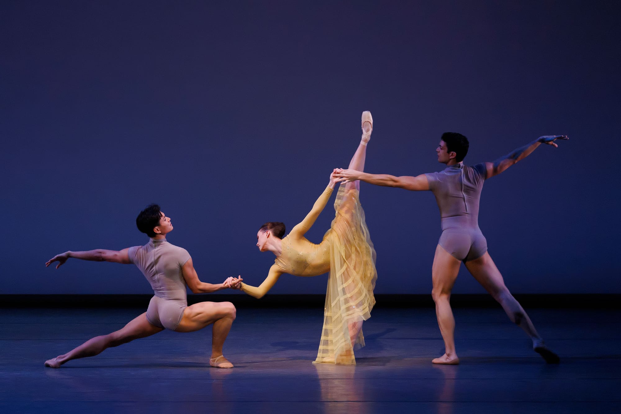 The calmer, dreamy second section opened with a group of men staring up at a large transparent triangle, which unfortunately resembled a giant bikini bottom, though the slow, elegiac music (an excerpt from Ottorino Respighi’s “The Pines of Rome”) and the lyrical choreography soon erased any questionable thoughts. The women wandered on in extremely flattering long yellow dresses, joined by men who occasionally looked like a shimmering school of fish swimming around some exotic underwater flowers: bare legs and silver onesies are not a flattering look.
