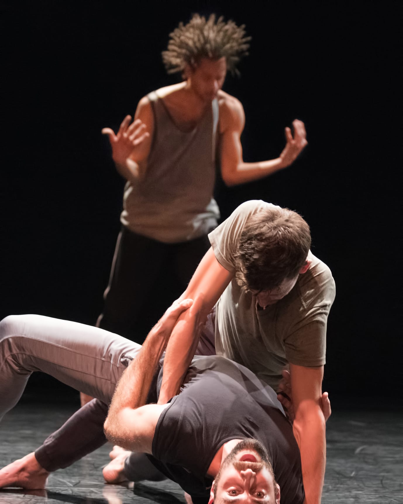 The duets intersected and competed with solos of obsessive movement – Crossman’s shivering torso, Kotze endlessly curling and re-curling her arms, Jones’ pattern of arm thrusts and bent knees. Jones’ repetitive meme was the most dervish-like in its meditative power. Starting slowly, her long solo sequence built to a relentless pattern of arms thrust down as her knee bounced her torso downward to most closely evoke a trance of religious ecstasy. Because the stage is so large, the audience was often faced with multiple patterns to look at – and often had to choose. Depending on where one sat in the three-sided audience, one dancer or one duet was likely to be in the foreground, the others’ frantic movement just background noise to whatever was holding immediate attention.
