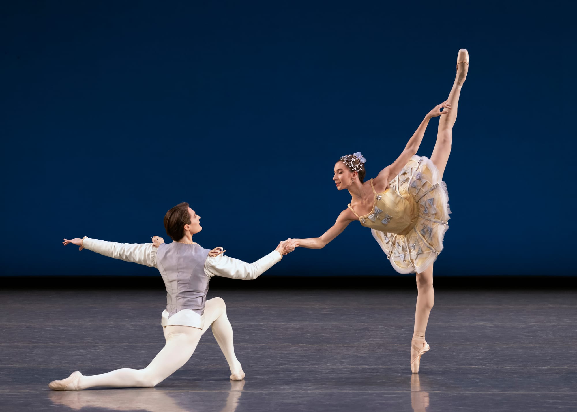 The work isn't all andante of course, and it was led by the scintillating Tiler Peck and Joseph Gordon at his generous, noble best. Peck's solo, with its sparkling footwork, was both incredibly fast and generously clear; she seemed to manipulate time, as the steps cascaded out by the millisecond yet with such clarity that the audience was able to pause to enjoy each one, as her upper body floated above it all with a musical ease. The four other women (Isabella LaFreniere in her debut, Ashley Hod, Ashley Laracey, and Emily Kikta), danced their solos with a radiant confidence; LaFreniere was fast and playful, Hod seemed to caress the air with her jumps, Laracey had a leggy chic, and Kikta used her legs with a controlled exuberance. Aaron Sanz and Davide Riccardo (a debut) danced the opening theme, seeming to toss the steps to each other in a generous conversation. Sanz, with his long, elegant line and quiet commitment is a remarkable dancer, a distinctive romantic present with worked well with Riccardo's more centered nobility.