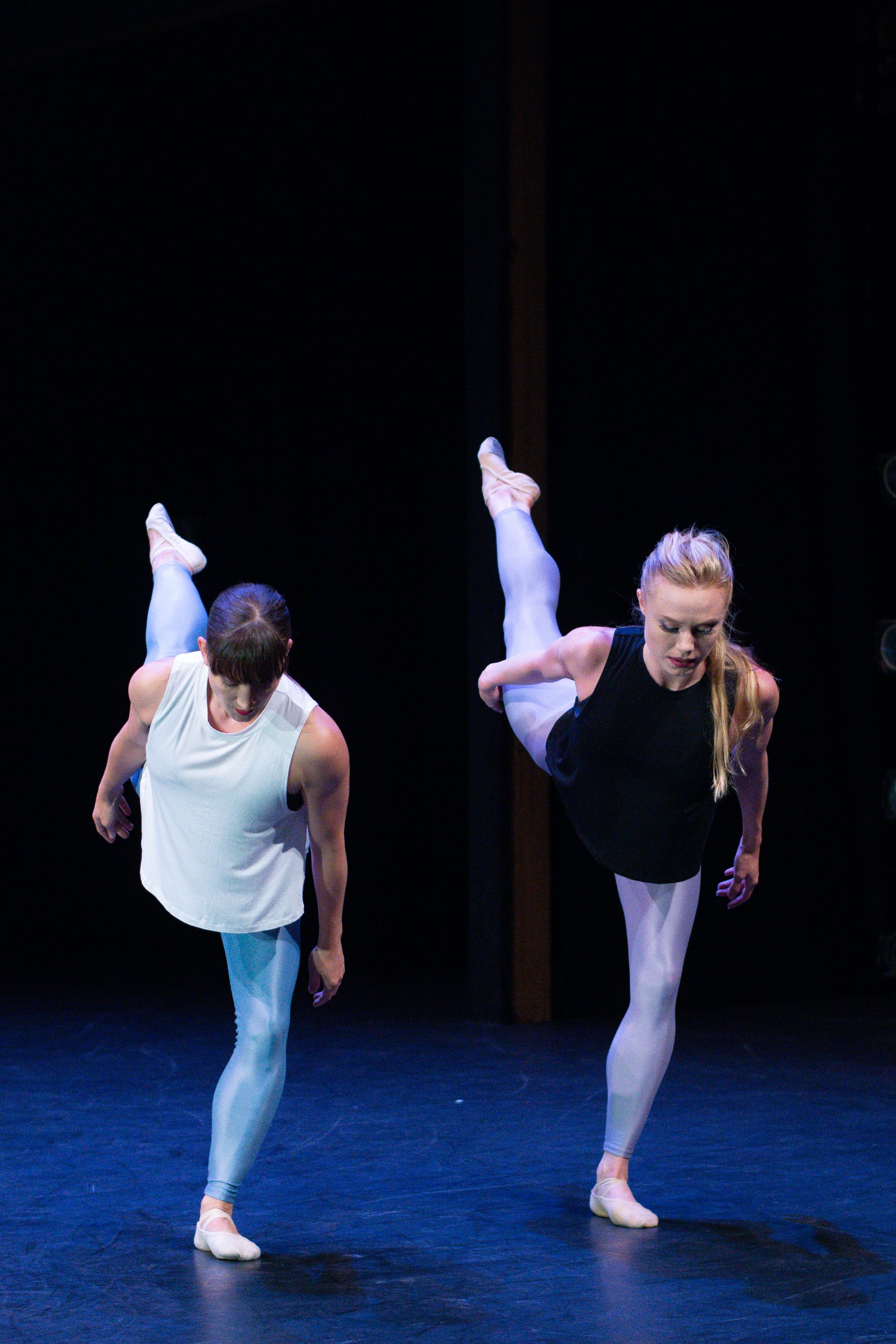 Gerring has the dancers working first on opposite sides of the stage, each appearing initially in arabesque. They go on to execute unrelated movement, but then suddenly coalesce into the same steps and gestures. Throughout the dance, disparity moves into synchronicity just when it seems needed. Because the duet was made for two ballet dancers, and the vocabulary incorporates a number of ballet steps such as arabesque, passé and grand battement, the women looked comfortable and at ease. They didn’t make eye contact until near the end of the dance, and when they did, they were smiling.