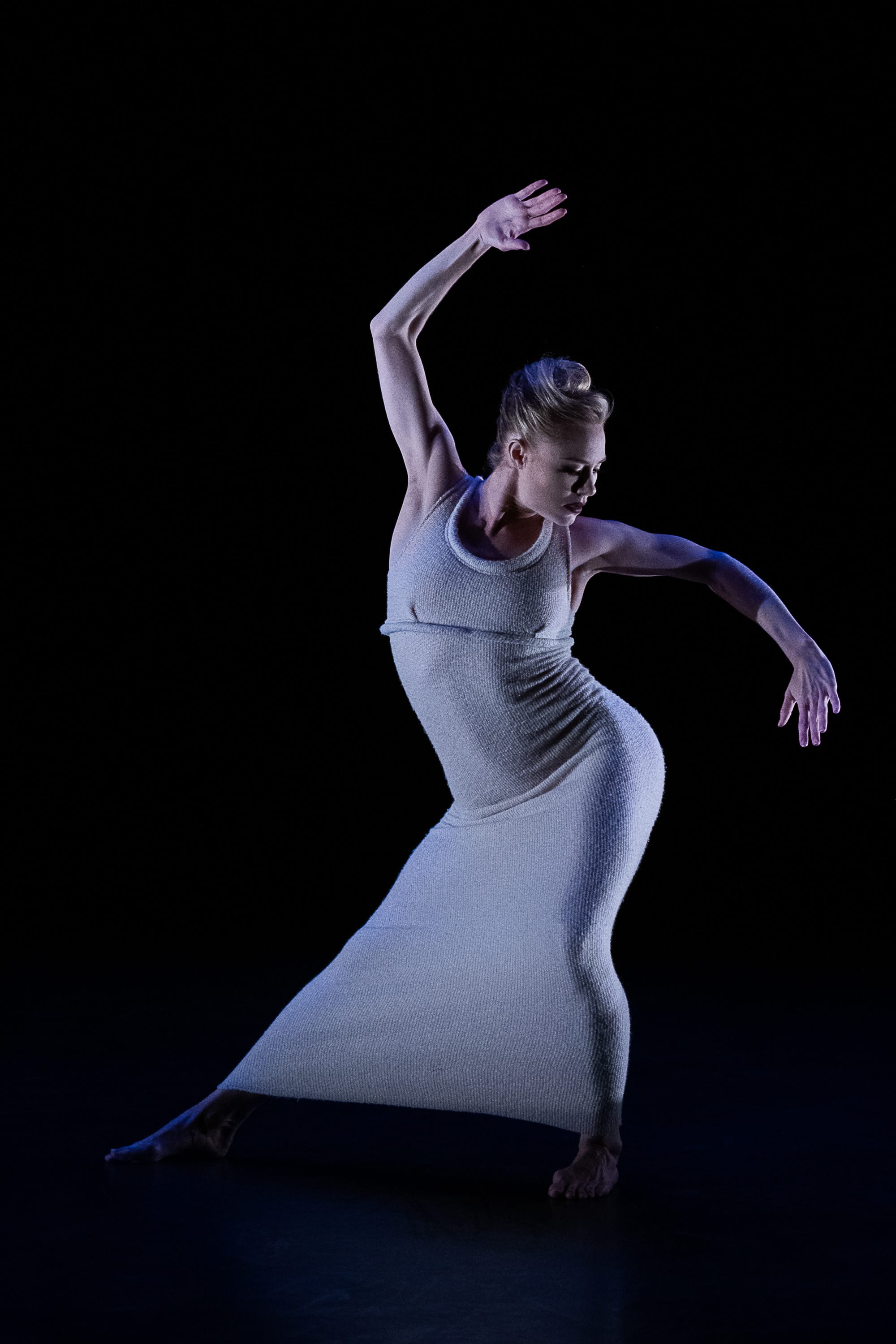 The program opened with Graham’s 1933 lost solo, “Ekstasis” reimagined by former Graham principal, Virginie Mécène. Mécène, of course, can imagine the dance any way she wishes since it doesn’t exist in its original form, but what we saw of Mearns seemed to have little to do with Graham, with the exception of the floor-length, tubular gown, which made up her costume. Graham’s movement, especially in the 1930s, was so angular one critic compared her to a cube. Mearns couldn’t be angular if her life depended on it. She is all curves, including her hyperextended limbs. She bends, she is pliant, even in the most virtuosic moments of a dance. This may have been why the solo Mécène fashioned for her looked far closer to art nouveau serpentine than art deco geometry.
