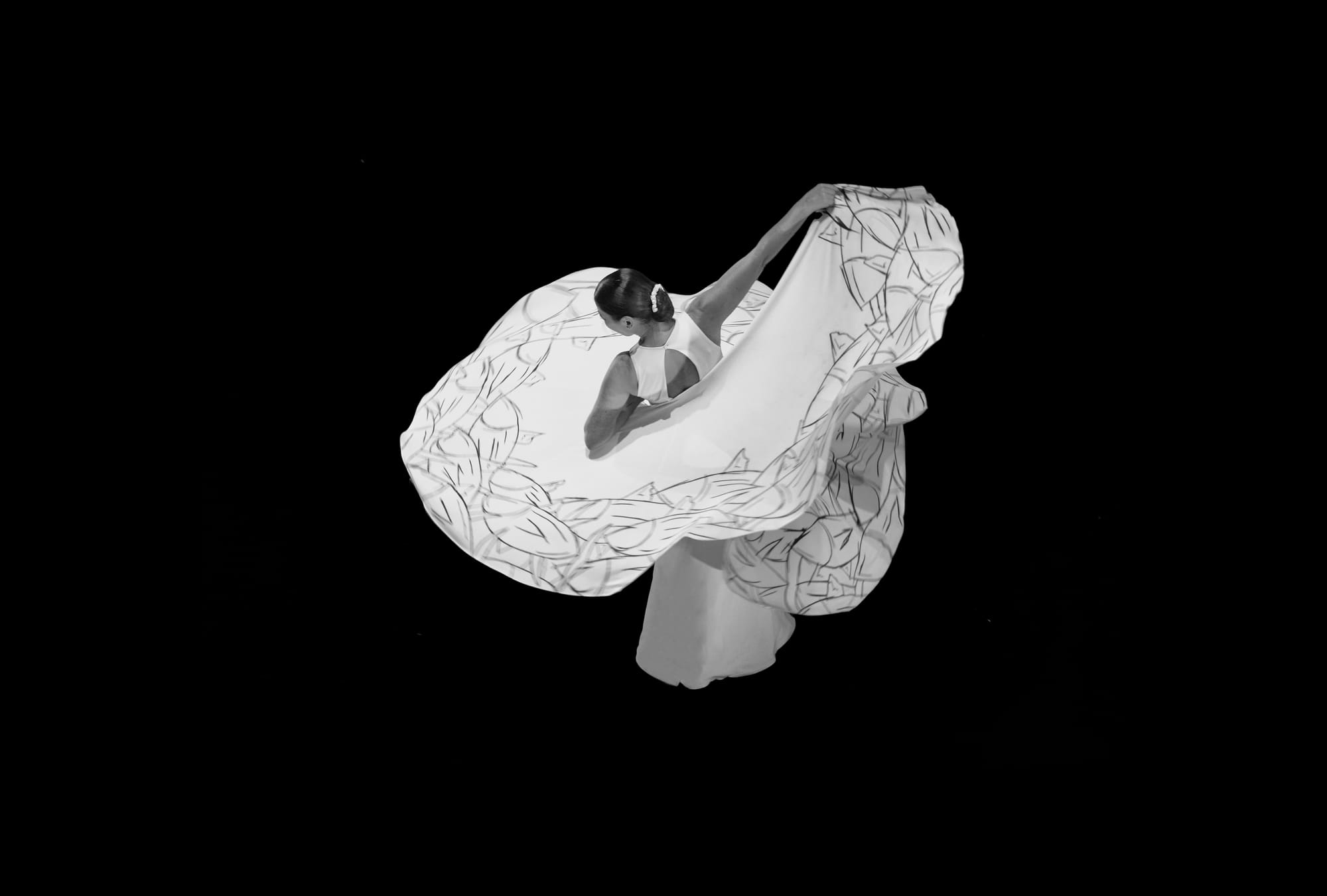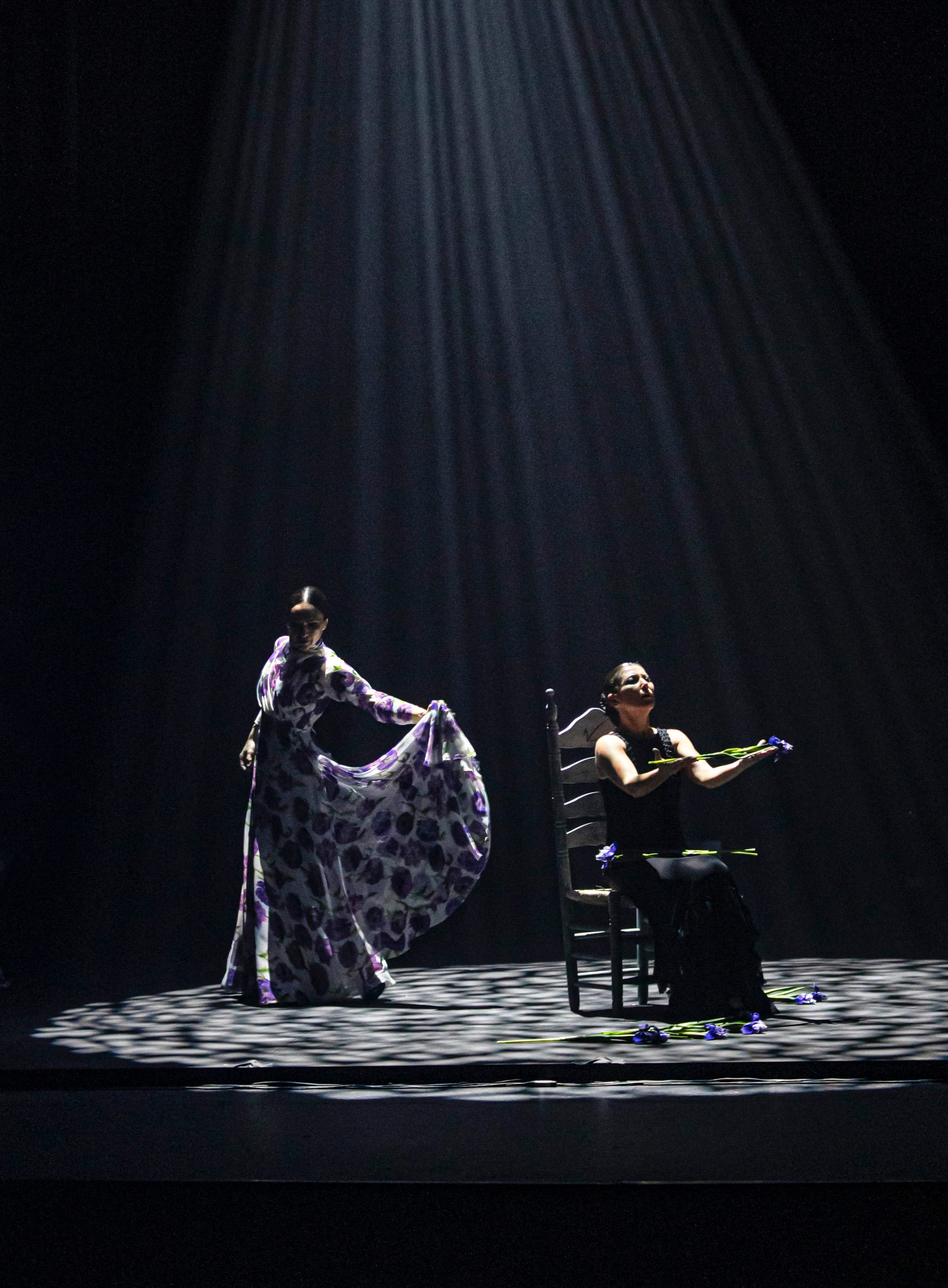 The dance then shifted to another section (“Root”), where Baras’s dancing with singer May Fernández allowed more of the grief. It was a dialogue, and Baras would stop, as the musician would approach her, gently tapping, the rhythm intensifying and slowing, like a tortured beating heart. Although expressive, this story ended with her grabbing her own throat, as if stifling a scream or an emotion she dared not release despite all that was said. Then, just as the act seemed to reach its darkest point, the story shifted. Women drifted across the stage in stunning flowered dresses – a procession of mourners transformed into something blooming, romantic, and alive. It was one of the evening's most haunting images: grief rendered not as darkness but as flowers, the very moment death began its passage into flight.