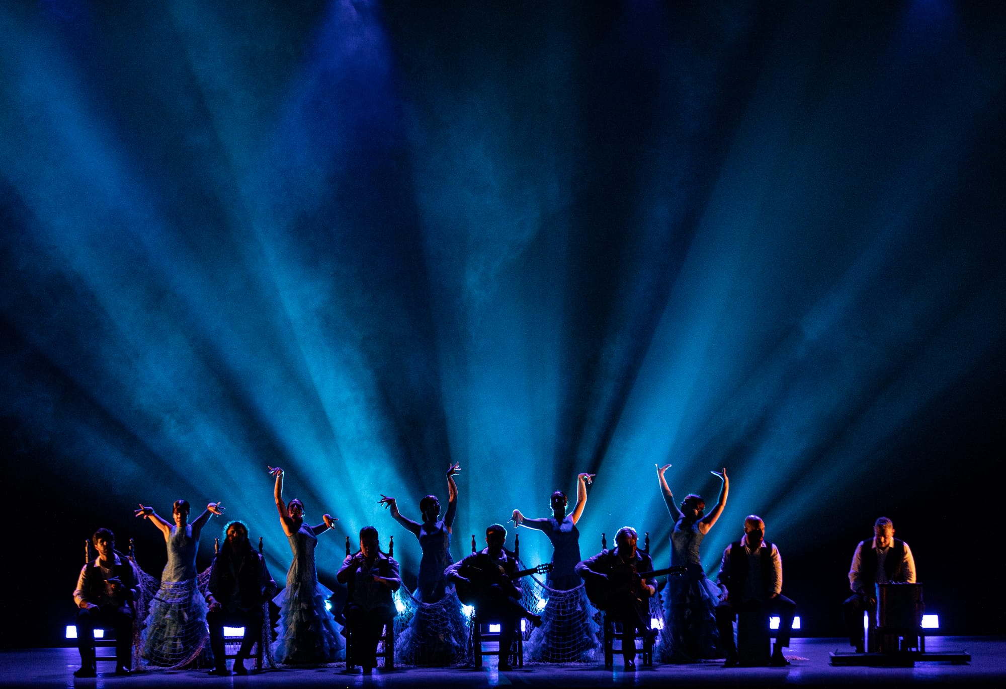 The second act, "Sea," was devoted to passion, though it might more aptly have been titled “Seascape” – so thoroughly did it traverse the textures and imagery of the natural world. Baras first appeared in silhouette against a design looking like abstract swallows in flight, moving through an assortment of classic flamenco poses that showcased the pure, austere beauty of the form. Then she began to spin, and her dress came alive. Forming shapes that evoked sea anemones and orchid petals, the dress was an accessory for sure, but in Baras’s handling it was also a collaborator – a respected partner in crafting the images she wanted to convey. Her footwork channeled energy not as a display of virtuosity but as something wholly organic, as though the music had no choice but to move through her. Soon she was joined by a second dancer whose movements echoed her own, like a mirror image, reflecting and passing on the movement as though carried forth by wind. Baras ceded the stage to five women in blue traditional dresses, but moving quietly like waves thanks to their barefoot dancing, with mantónes that looked like fishing nets. It was a unique dance – classical flamenco married with something modern, and when they departed, leaving those nets draped over chairs that then welcomed the musicians, the effect was quietly poetic: the sea passing its force and bounty to the land-bound souls.