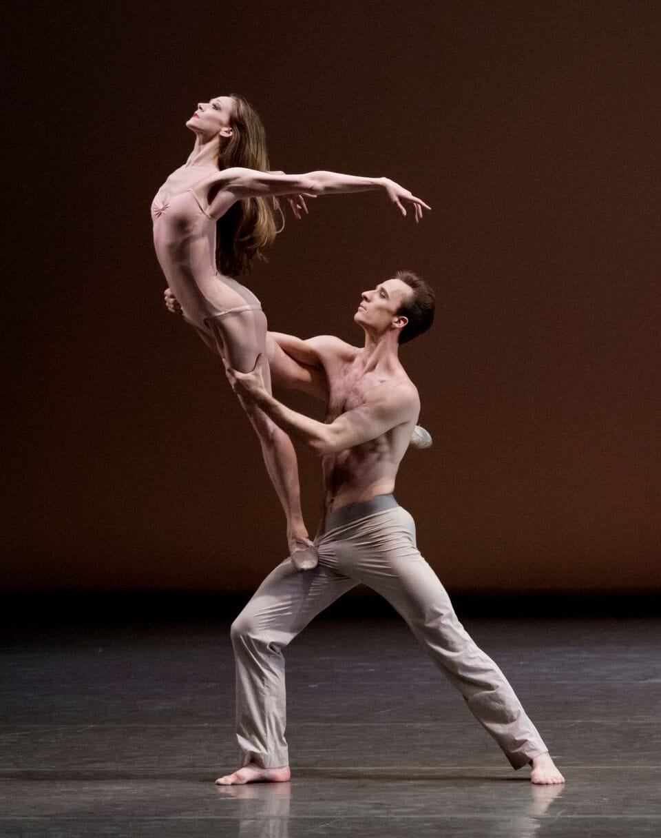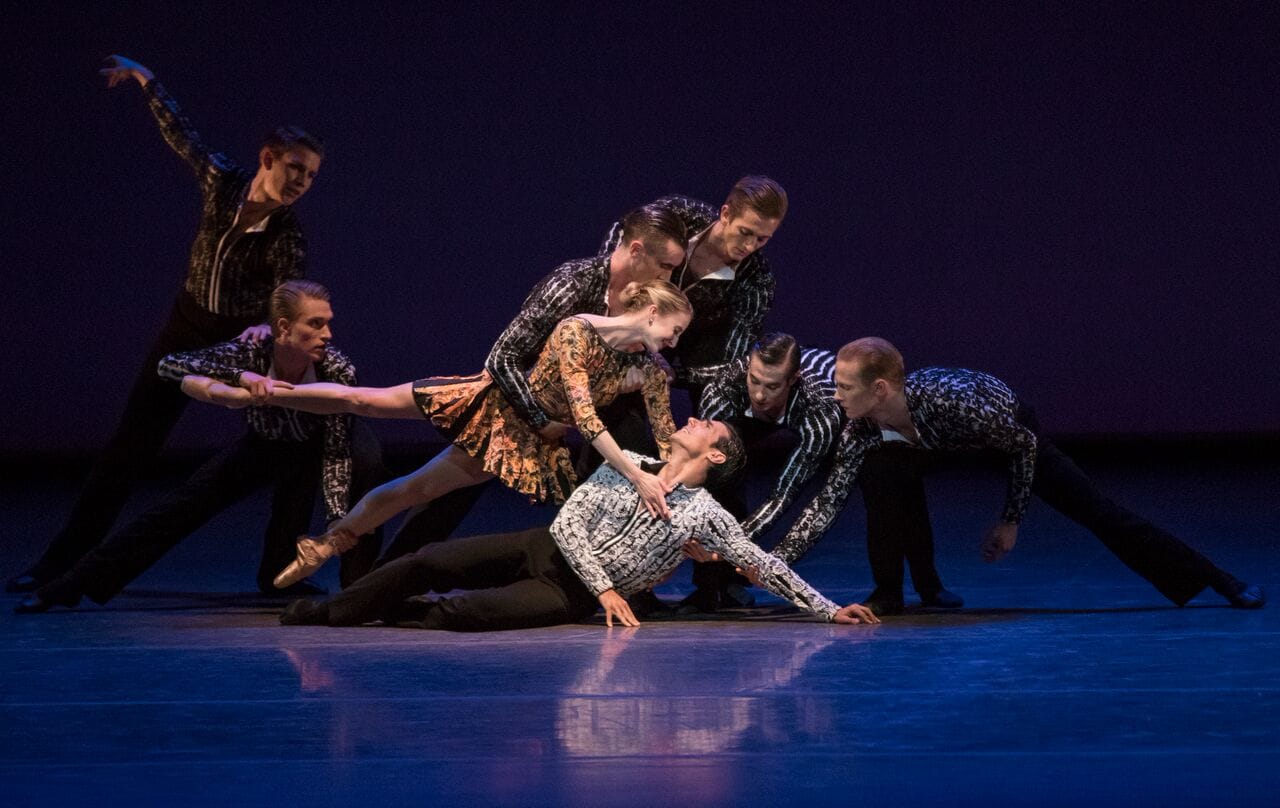 Ratmansky uses three couples (Sterling Hyltin with Joaquin De Luz, Sara Mearns with Amar Ramasar, and Tiler Peck with Taylor Stanley) and a corps of twelve. The principal women wear colorful, flattering short dresses (costumes by Keso Dekker) and the men are in tight, shiny shirts which hint at a louche vulgarity; the women have bare legs but for once this irritating affectation fits the mood. The episodic music makes it seem as if the three couples belong to intersecting short stories as they weave in and out of the corps.