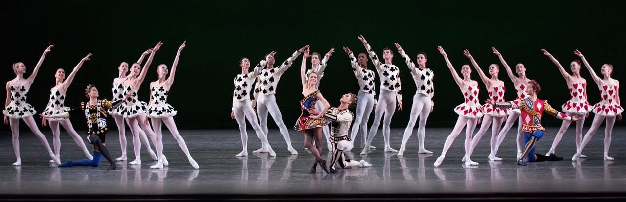 The four principals (Megan Fairchild as the Queen of Hearts supported by three kings (all debuts), Joseph Gordon as Diamonds, Harrison Ball as Spades, and Aaron Sanz as Clubs) danced clearly and sharply, with unforced charm. Ball, especially, made a plush, elegant King of Spades; he made standing still and acknowledging Fairchild look like gods still walked the earth.