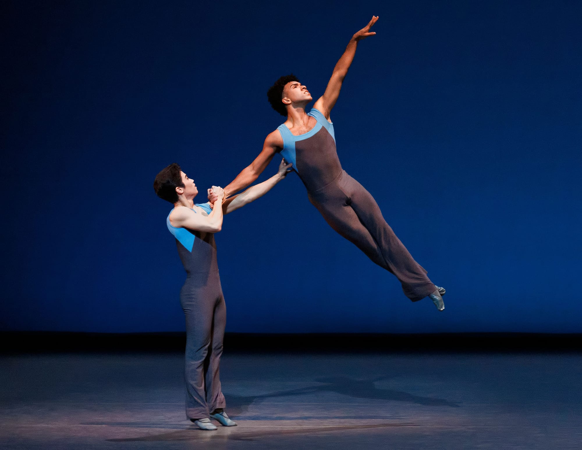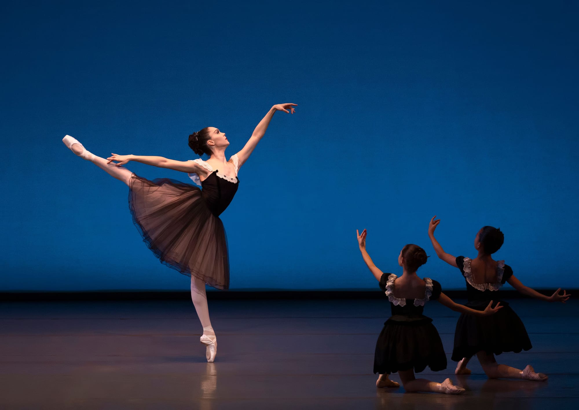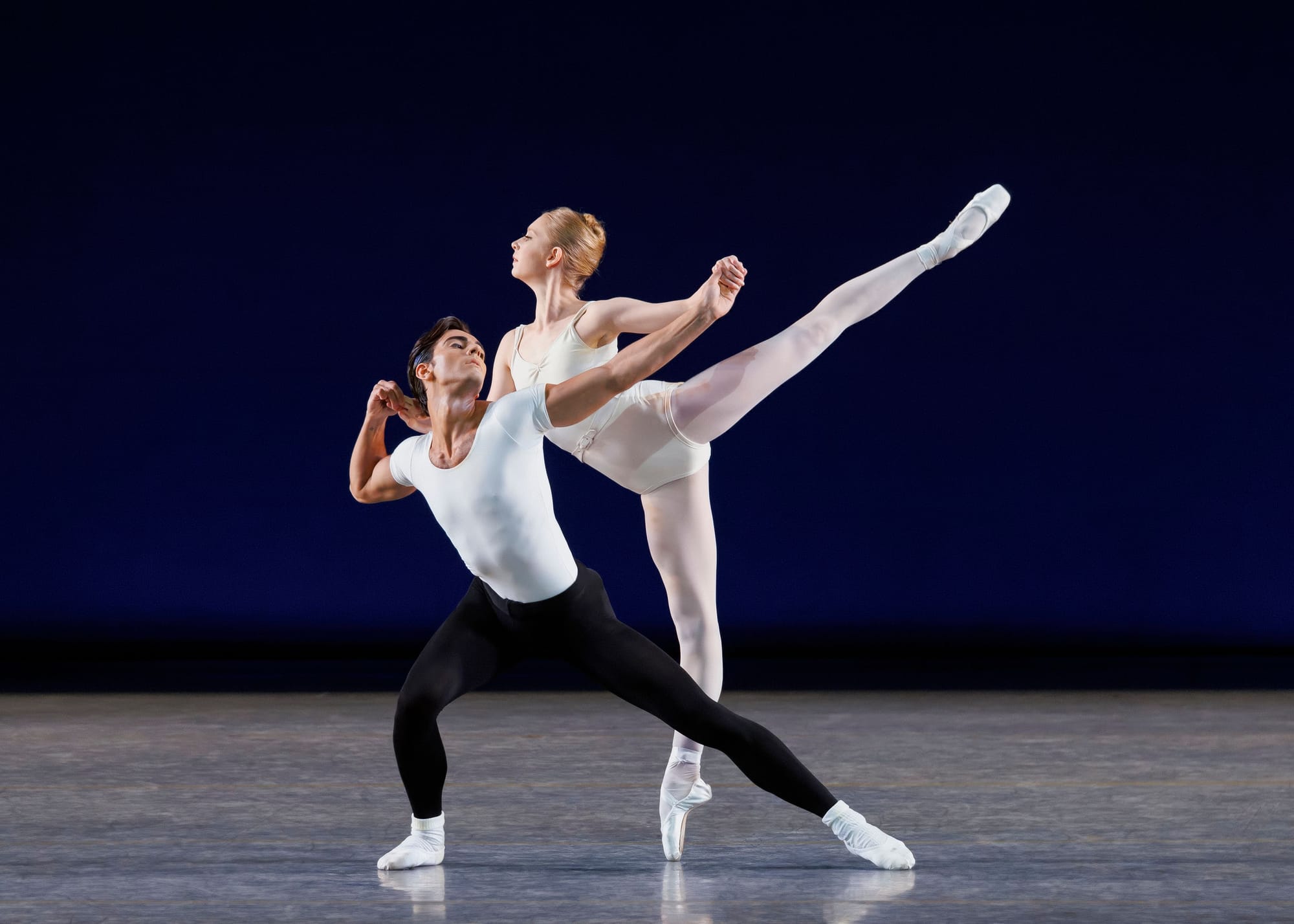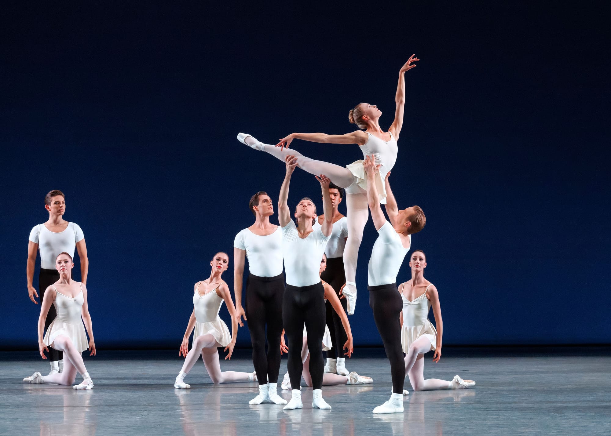 The middle pieces, usually abbreviated “Monumentum/Movements”, are both brief, abstract black and white ballets set to Stravinsky for a couple surrounded by a small corps. Though superficially similar, they demonstrate Balanchine’s range. “Monumentum” is an abstract look back at the Renaissance madrigals of Don Carlo Gesualdo, and “Movements” is an exploration of varieties of movements inspired by Stravinsky’s twelve-tone composition. Miller and Sanz were an elegant couple in the first work, evoking the cool, formal world without any extraneous flourishes. Miller’s extravagant arabesque and fearless thrust made the final throws, as she was tossed to the waiting men, breathtakingly exciting.