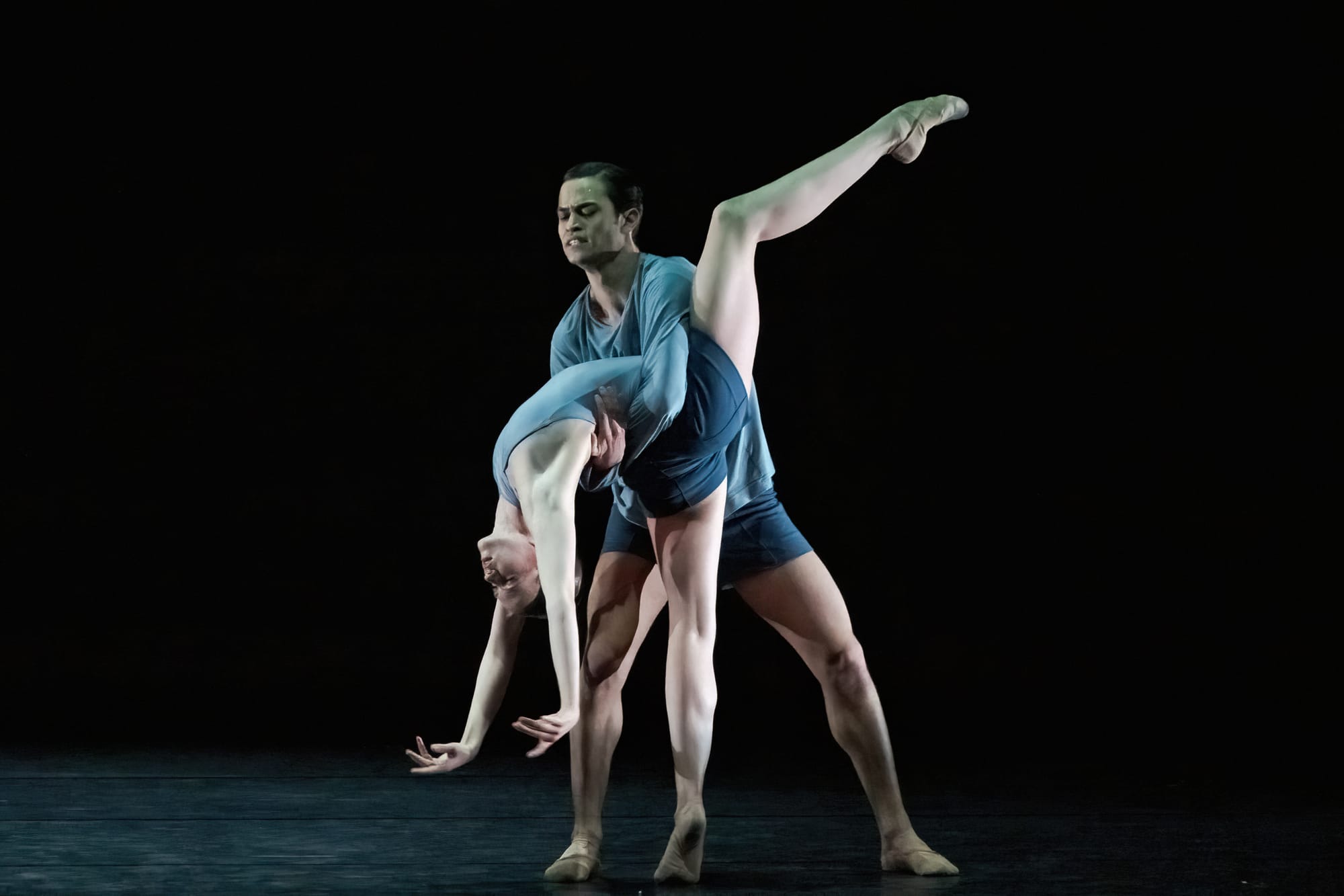 Roman Novitzky, artist in residence with Stuttgart Ballet, created “A Dialog” set to Nina Simone’s iconic “Sinnerman”. From start to finish, it was a tour de force. Soares da Silva did well with it (especially as he had to learn the choreography on short notice), but the piece was really a showcase for Brown, who had many solo moments. The dynamic choreography fit her like a glove. It was hard to tell how much of the effect was Novitzky’s skill as a choreographer and how much was Brown infusing it with her own intuition and style, but the end product was electric. The dancers wore simple blue costumes (designed by Novitzky) and soft shoes. The movement followed the arc of the song, taking the audience on a journey. The choreography was varied including isolations, grounded and heavy movements, grooves and alternating tension and release. Whether doing a silent tap dance-like sequence or making gestures as if drawing in the air with her finger, Brown moved with conviction and was always right in the music. She showed tremendous stamina and range. She also has a way of hiding the preparation before a step, creating an element of excitement and surprise. While she may not have been the showiest dancer of the classical round, here she demonstrated a different type of virtuoso performance equally impressive as any number of fouettés.