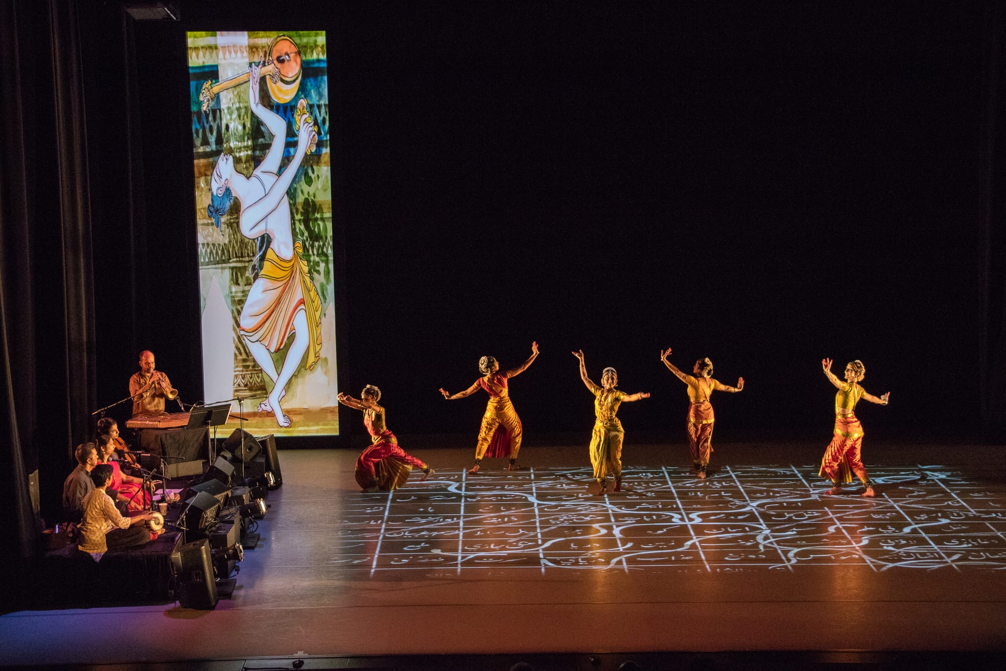 The performance was broken up into three sections to frame a story inspired by “The Conference of the Birds,” a Sufi epic poem that details an expedition traveling through various human states of being, the ultimate goal being a unity with the divine. Segments of the show were punctuated by moments where the dancers left the stage completely, continuing on their journey while the musicians alone entertained the crowd with complex beats interlaced with hints of jazzy improvisation and impressive traditional vocals rolling effortlessly off of Preethy Mahesh's trained tongue. The composition itself was developed by Amir ElSaffar and Prema Ramamurthy, specifically for “Written in Water,” in collaboration with Ranee Ramaswamy and the rest of the musical ensemble. Additionally, artwork depicting various human and animal forms as well as abstract, spiraling shapes were incorporated into the show through projections on the floor and on a skrim backdrop. They were created by V. Keshav, a Chennai-based painter, and Nathan Christopher.