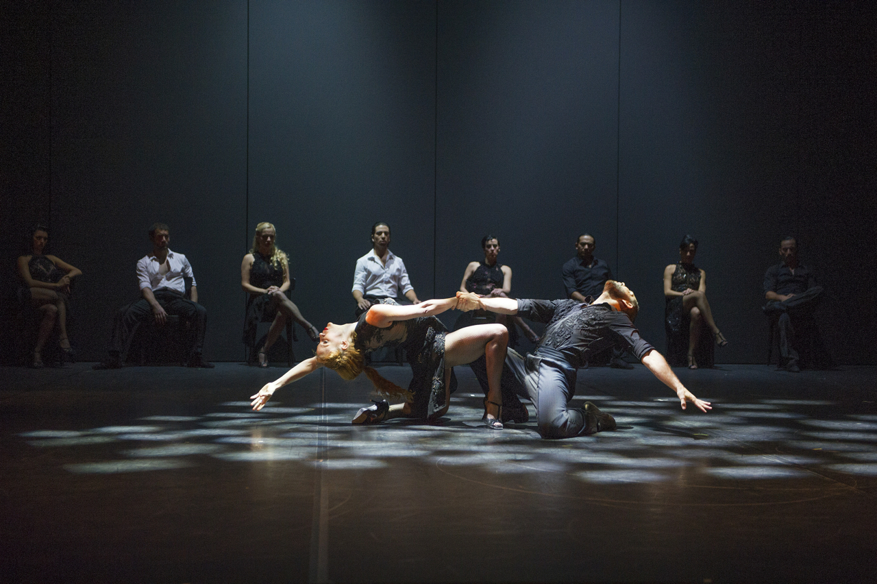 The first couple presented Cherkaoui’s theme of zooming in on different aspects and emotions within tango. Dancing almost the entirety of their duet back to back, the dancers explored the connection they felt between each other. The couple wandered through the stage as though looking for something, or some way to realize the attraction they felt, and when their eyes finally locked their movements slowed and they explored the dance’s connecting powers with curiosity, taking their time reducing the physical distance between them. The couple was then joined by others, and the dancing progressed as though at a real milonga, with each couple existing in their own, distinct private world even if the movements they performed were largely identical. First exhibited in this dance, the display of individualities and differing stories were a constant in the show, and when the different couples ended up alone on stage at different points in the evening each of their tangos was different: some were stories of attraction, some of jealousy and possibly betrayal, such as a tango for three with two women seamlessly alternating places with one clearly an interloper, some were stories of passionate fights and reconciliations.
