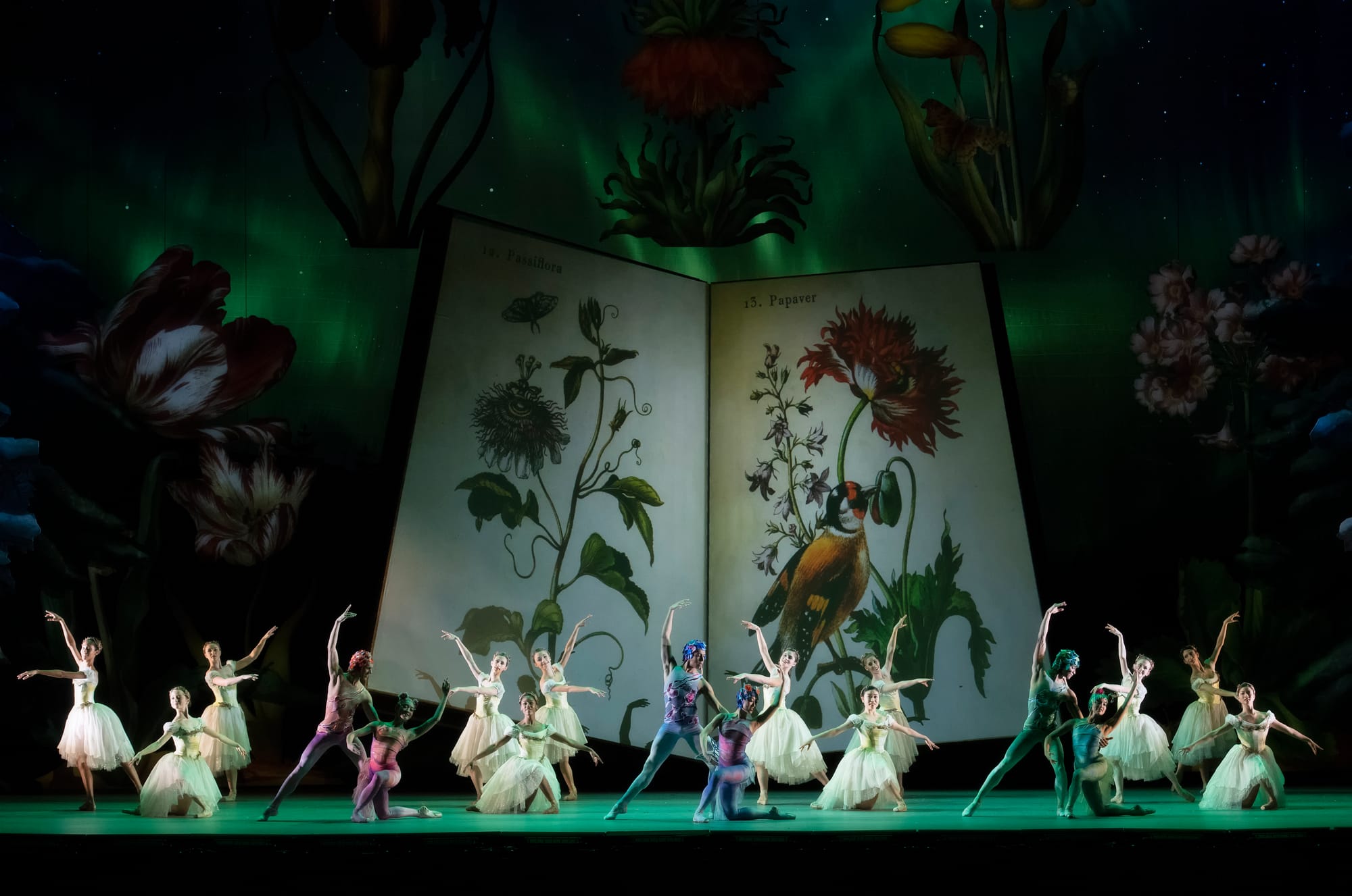 If Act I showcased the production’s technological virtues and clear narrative, Act II provided a full palette of colorful dancing. Set in the evening amidst a starry sky of northern lights, we were transported by a colossal storybook on a journey to faraway places, the pages of the book serving to orient and set the mood. Possokhov’s appealing choreography juxtaposed classical dances with contemporary accents. The iconic Waltz of the Flowers was particularly striking, featuring a classical corps of twelve women in pastel tunics moving gracefully through various patterns of Tchaikovsky’s waltz, while three pairs of dragonflies and roses in colorful unitards danced with angular contrast, creating a thrilling visual spectacle. Other highlights included Lucas Labrador’s sensational jumps in the Spanish divertissement, Darian Kane’s mysterious and sumptuous Arabian variation, and Fuki Takahashi’s piquant Chinese dance. Jackie Nash and Jacob Bush as bobbing (but spritely) French Roosters brought ridiculous fun to the adventure.