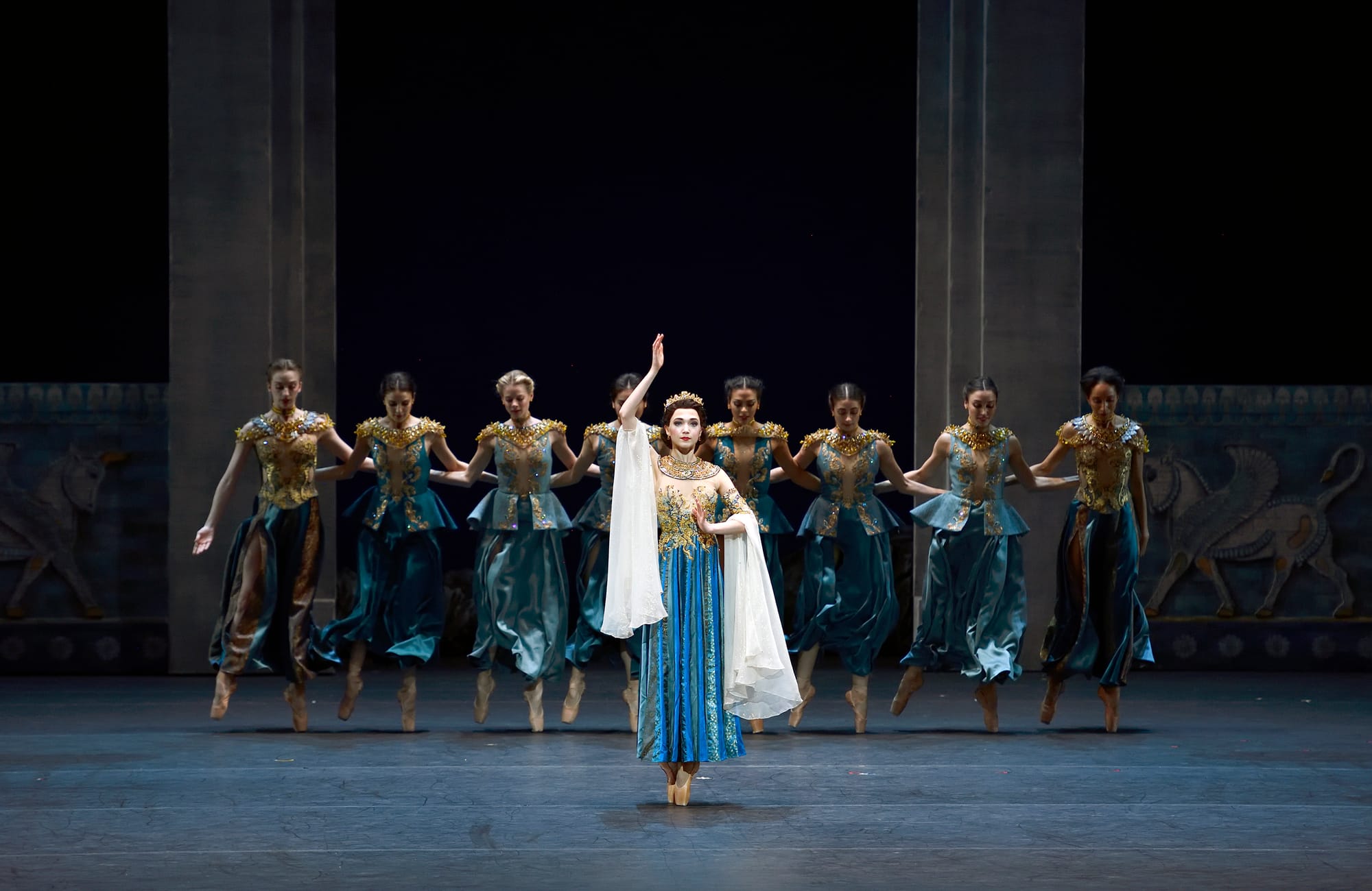 The score Ratmansky chose, a reworking by Philip Feeney of Aram Khachaturian's 1930s Soviet ballet "Gayane" (about treachery in an Armenian collective farm) is full of lyrical melodies and muscular folk tunes, and helps set the mood and focus the action. So do the costumes by Jean-Marc Puissant, especially the delicately hued Grecian tunics worn by the female corps. The turquoise spangled Babylonian outfits, though, made it look like Las Vegas had originated on the Euphrates. Puissant's sets were suggestive rather than archaeologically solid, with wide vistas of Aegean blue, various painted scrims, and a few brilliantly effective props, which make the many scene changes seamless, as the ballet moves from Syracuse to Asia Minor then to Babylon.