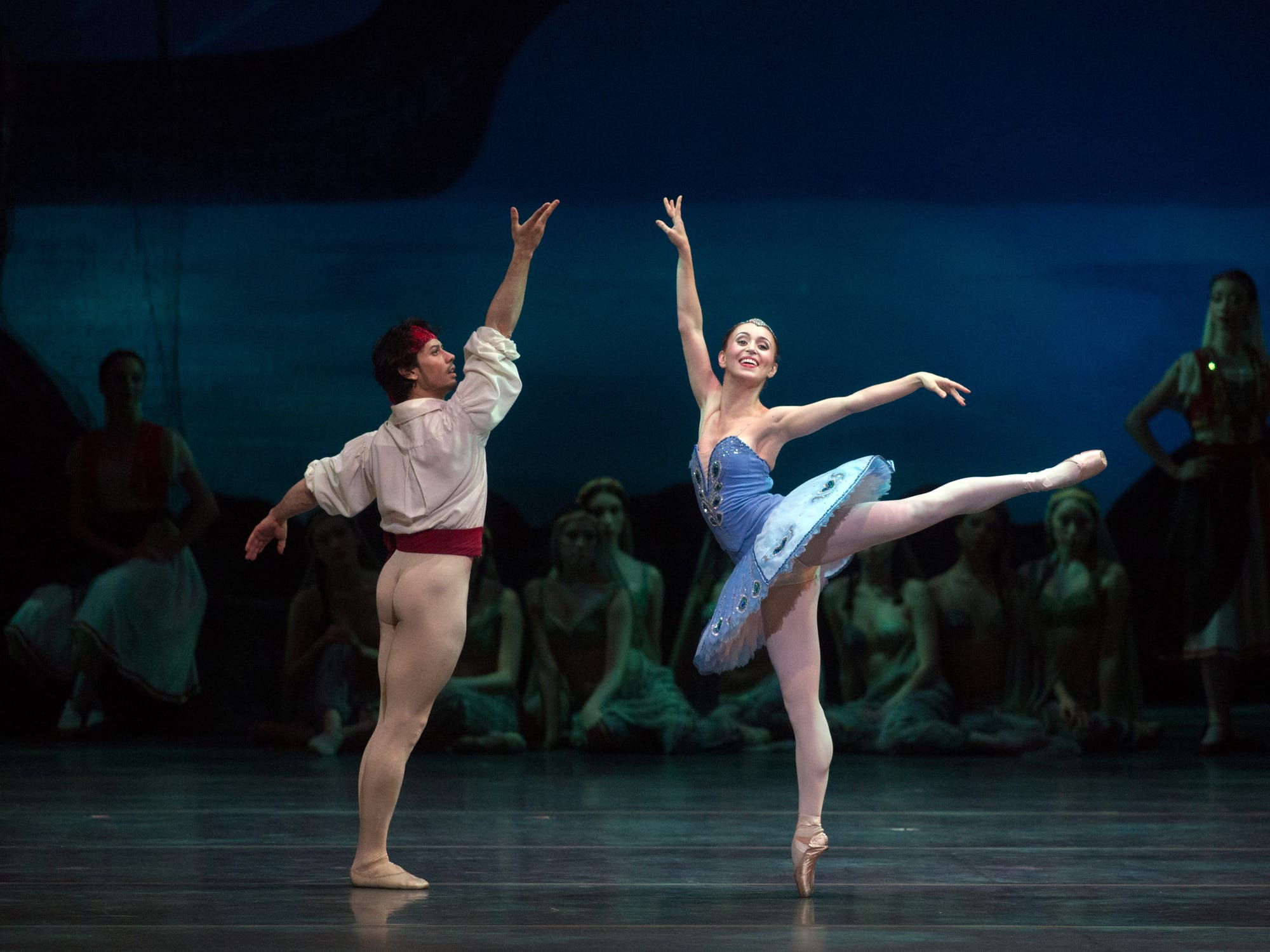 There are many roles, both large and small, so the ballet is a boon to ABT's dancers, though there isn't a great deal of subtlety or character- ization required. Skylar Brandt, a young soloist, danced Medora on opening night, replacing the injured Maria Kochetkova on very short notice. She danced with a fine, clear precision (her soft little jumps in her Jardin solo were beautifully shaped and she tossed off fouettés, both Italian and regular (alternating singles and doubles with only a bit of traveling), with apparent ease. She gave Medora a youthful spunk, punching Birbanto with gusto before she stabbed him, but overall her Medora was wide-eyed and sweet natured. She didn't have the take-no-prisoners hauteur that can make those grand old ballets revive the past, when ballerinas might play peasants but would go home to a drawer full of diamonds, and she was a bit fine-grained and pure for the rip-roaring story. It was like being served on porcelain plates at a Fourth of July picnic. Nevertheless, it was a remarkably confident and engaging performance.