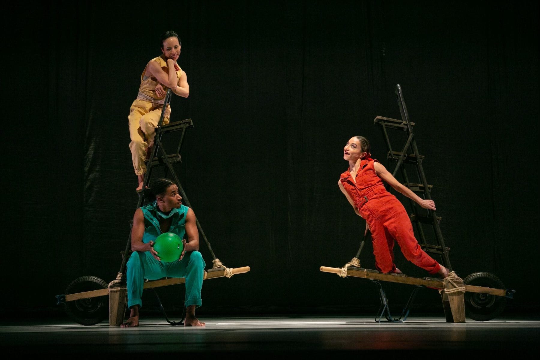 There was a lot of control in the second Rube Goldberg movement, where Lovette and her dancers seemed to be having a ball, quite literally, as several colorful ones were tossed around. The dancers, in candy-colored jump-suits, climbed up and around a couple of ladders with acrobatic, improvisational abandon (Madelyn Ho in yellow and Lisa Borres in red were especially dynamic). Lee Duveneck entered lying on a skateboard, which got tossed around and became part of the choreography. The dancing was inventive, daring, and great fun.