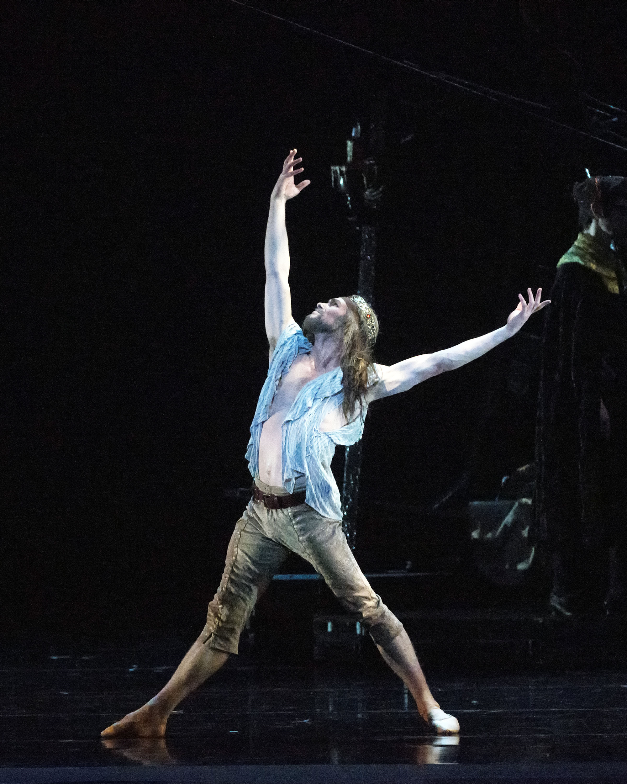Prospero and company also leave a magical world at the end of "The Tempest", but it isn't as clearly delineated as Ashton's. The notes describe the work as "a fragmented narrative as well as a meditation on some of the themes", which means that the audience needs to be familiar with the play to even begin to follow the action. And unfortunately, much of the choreography telling the story (however fragmented) looks a bit like a Classic Comic book version of Shakespeare's poetry. The dances for the magical Ariel, Caliban, and the sea dwellers, are glorious exceptions. The chorus, sea people with odd turquoise Mohawks, emerge from the sea in waves, catching the flow of the music. Ariel's music, too, had a rhythmic lilt, and Gabe Stone Shayer, with a bright red coral headdress, was a high flying marvel, combining virtuosity with pathos, as he reached forward to grasp his freedom. He exploded into the air when Prospero finally set him free. Caliban, Blaine Hoven, gets the final scene, as he is left on the island with knowledge he can never attain, tearing the book in inarticulate rage. Hoven moved with a heavy, threatening lope, but showed the glimmers of desire that Ratmansky gave him. However, the power of the final scene seems to come out of nowhere; Caliban had been just a peripheral figure until then, hovering at the edges.