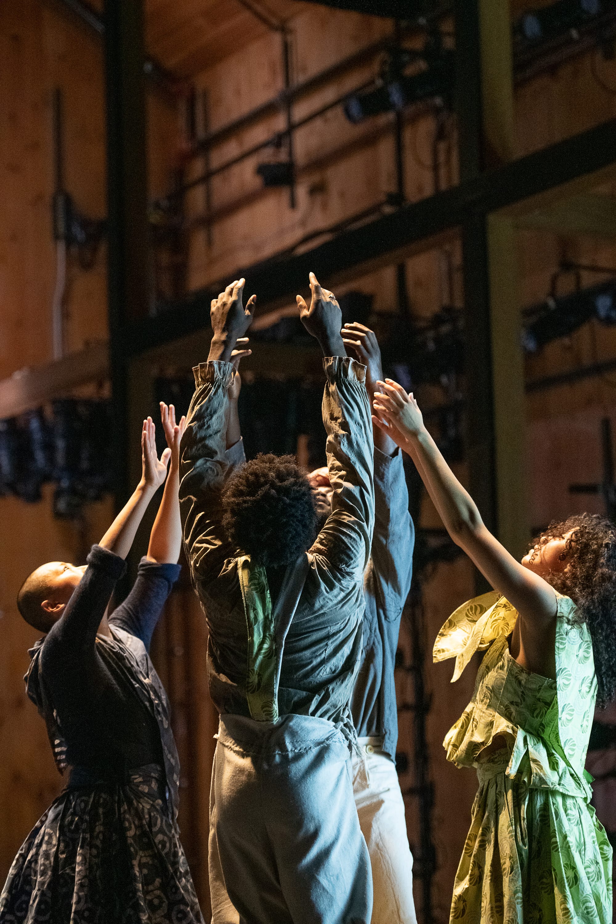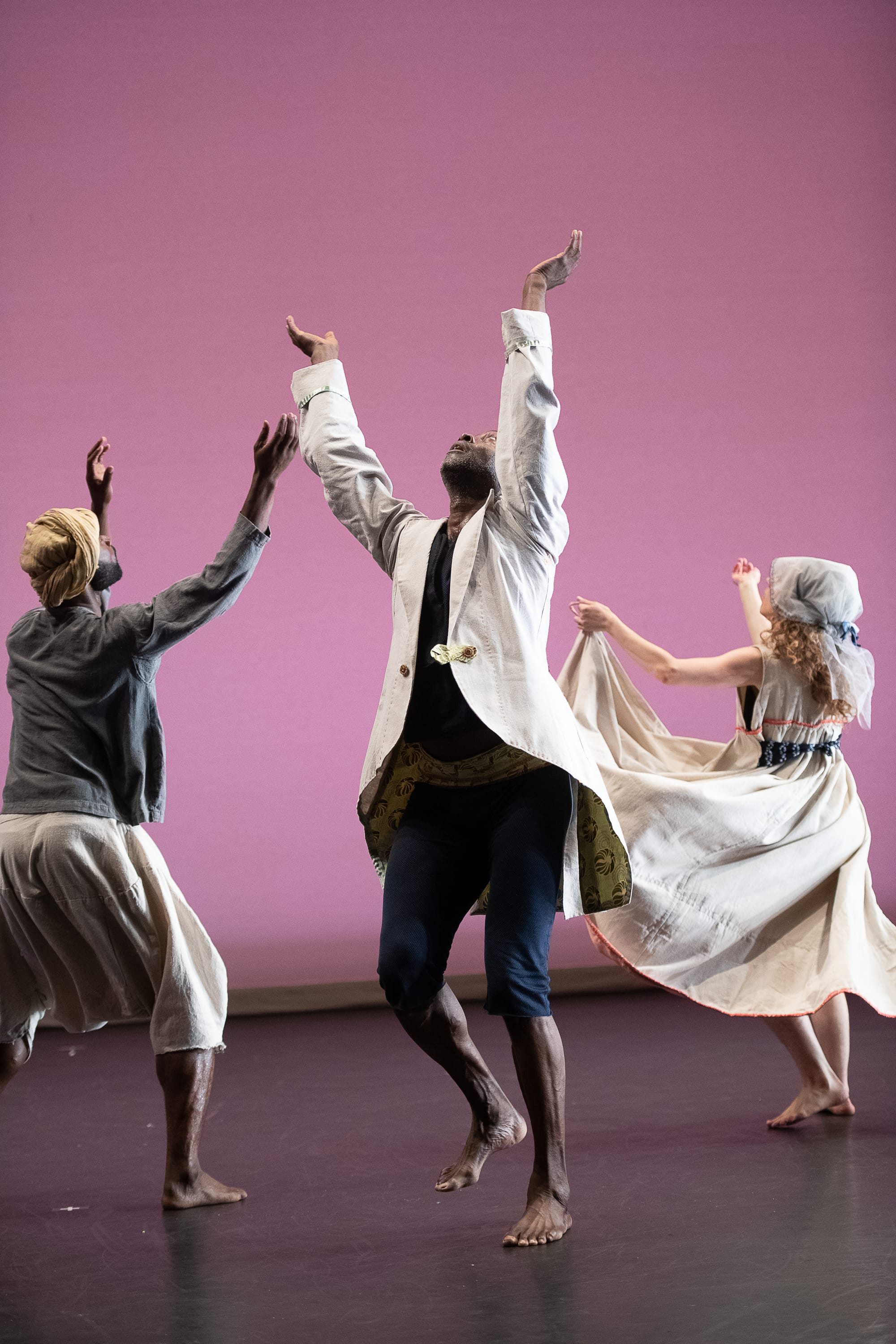 All of the dancers changed in and out of various costumes, pulling shirts, skirts, headdresses and overalls from pegs hanging in view at the edge of the stage. They shifted identities with their costumes — the layers allowing them to come from different time periods and places, moving in and out of work and church, partnering and community dances. Sun hats evoked field work; Paul Hamilton’s on and off long-tailed coat suggested a formal house servant. Every costume touched slave history, but slavery didn’t define the dancing — interior freedom did. In an early scene, Hadar Ahuvia and Gabriela Silva spun in wide skirts, their hair flying upward as their arms and hands stretched out and up, as if to heaven. The simplicity and freedom of their turning whirled spiritual energy through the space.