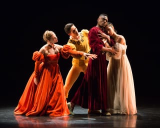 The evening’s middle piece was “The Moor’s Pavane,” Limón’s most renowned work, a marvel of economy and power. To the stately music of Henry Purcell, a group of four dancers enacted the drama of “Othello,” a short piece of tightly-coiled emotions, and the dangerous intersection of race, love, envy, and rumor, all anchored in a formal, stately diamond. Mark Willis, the Moor, embodied overpowering emotions in both body and expression, stillness and a stone face as expressive as his powerful movement. His Friend, David Glista, was serpent-like, twining his neck behind Willis’s to plant suspicion in the ear of the powerful Moor he envied. Even with his own wife, danced by Mariah Gravelin, Glista’s movement was seductively slippery, as he coaxed her to bring him the white handkerchief that was the evidence that sealed this tragedy.