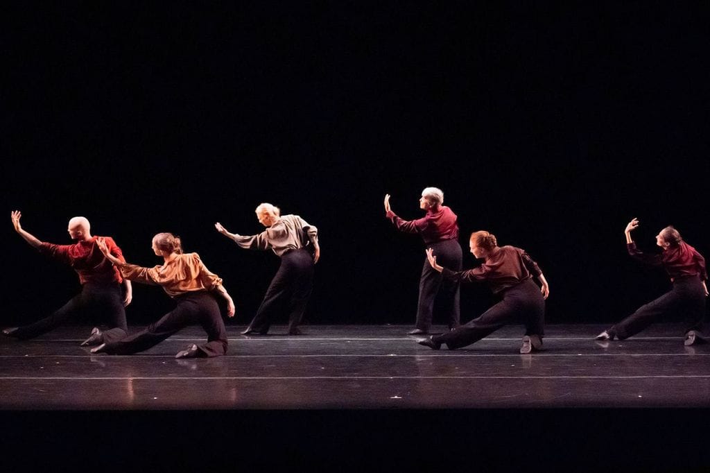 The evening opened with the equivalent of a group hug, as Limón’s early solo “Chaconne” (1942) was reconfigured as a large dance for the company, several retired Limón dancers, and students. The music, the Chaconne from Bach’s Partita #2, was played live by violinist John Marcus. The stately group, dressed in back pants and shirts of muted colors, glowed in the light, as they acknowledged the musician with gracious arms. The simple, elegant, and dignified moves, repeated with subtle variations, as smaller groups and occasional soloists emerged from the mass (Lauren Twomley danced an especially incisive solo), seemed to build in excitement. It was also quite moving to see retired Limón dancers like Jonathan Riedel and Kathryn Alter, whose incisive upper body was a standout, on stage again.