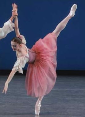 "Valse-Fantaisie", set to a wind-swept, spun sugar score, is a pink swirl of non-stop allegro dancing, led by Erica Pereira and Daniel Ulbricht supported by four energetic nymphs. Pereira's jumps and turns were lilting and airy but her rather sloppy arms and flat hands gave a rather two-dimensional air to her dancing--a bit of 19th century epaulement never hurts when dancing to Romantic melodies. Ulbricht is not a light dancer, and gave his role a welcome hint of weight setting off the lighter. He seemed not to defy gravity, but to conquer it with a plush power.