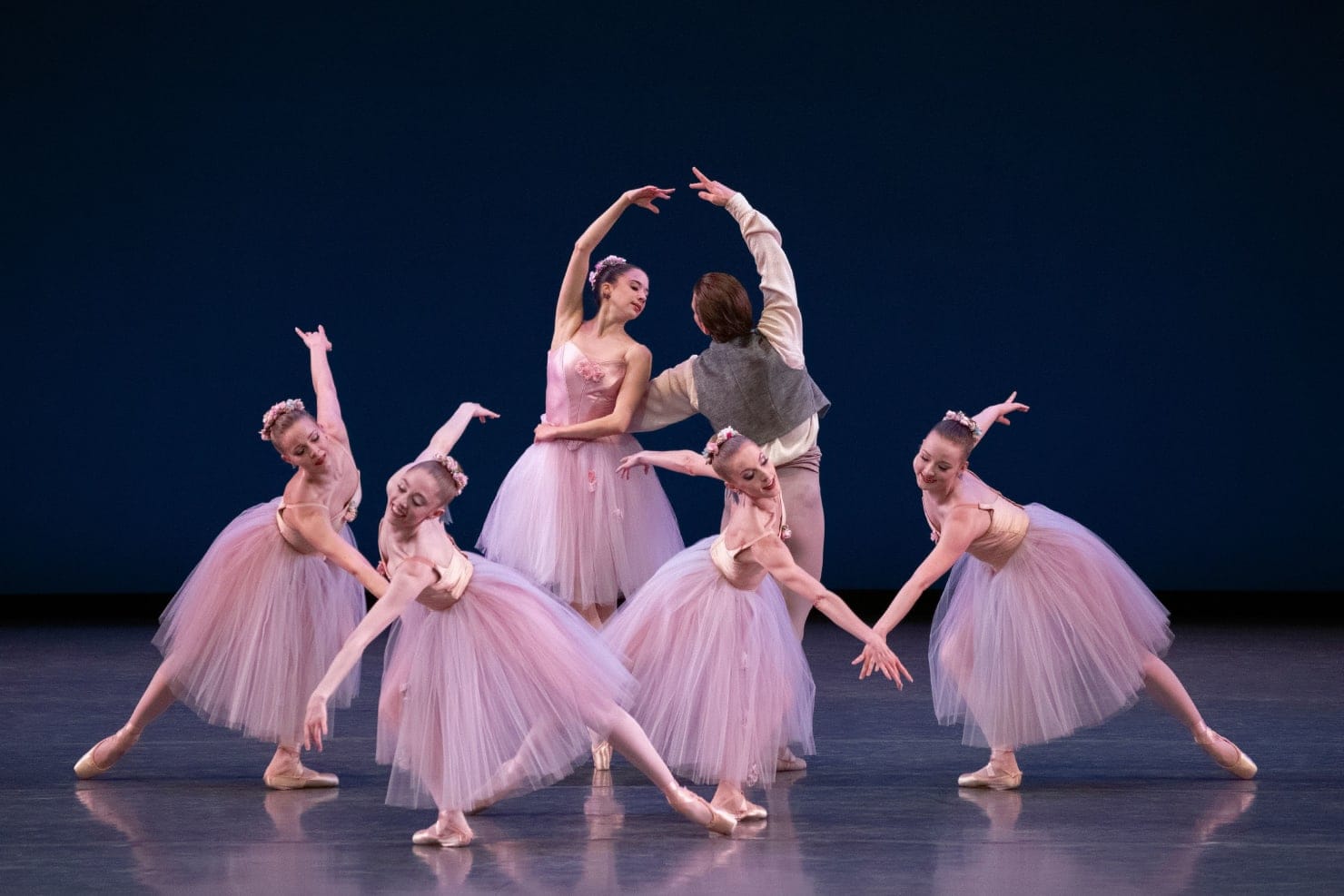 Indiana Woodward, making her debut, and Harrison Ball, who danced it in 2020, were the main couple, supported by four couples. It opened formally, with the couple bowing to each other, and the dignified and intense Ball alone bowing to an invisible partner, the poet looking for his muse. Woodward entered and they danced and oddly cool pas de deux, with traveling lifts and pawing legs. Woodward gave the role hints and gleams of emotion, without excessive emoting; she was controlled yet warm, and her eventual departure, leaving Ball alone, had a mysterious inevitability.