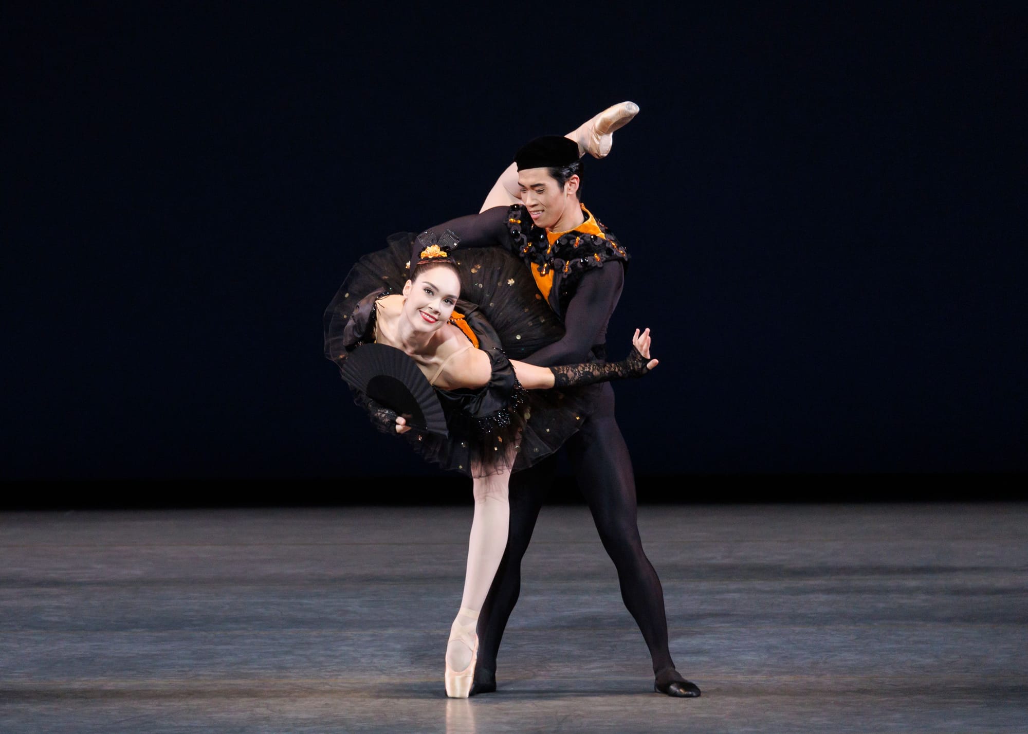 Isabella LaFreniere’s balances where she stands on one pointed foot between the two men until she proudly offers them her hands, were effortless, but I missed the slight hesitation and self-satisfied gleam that can emphasize the witty “I can conquer gravity” triumph. Her “castanet” solo in the Bransle Gay, though, was wonderful, with clear, rippling shapes.