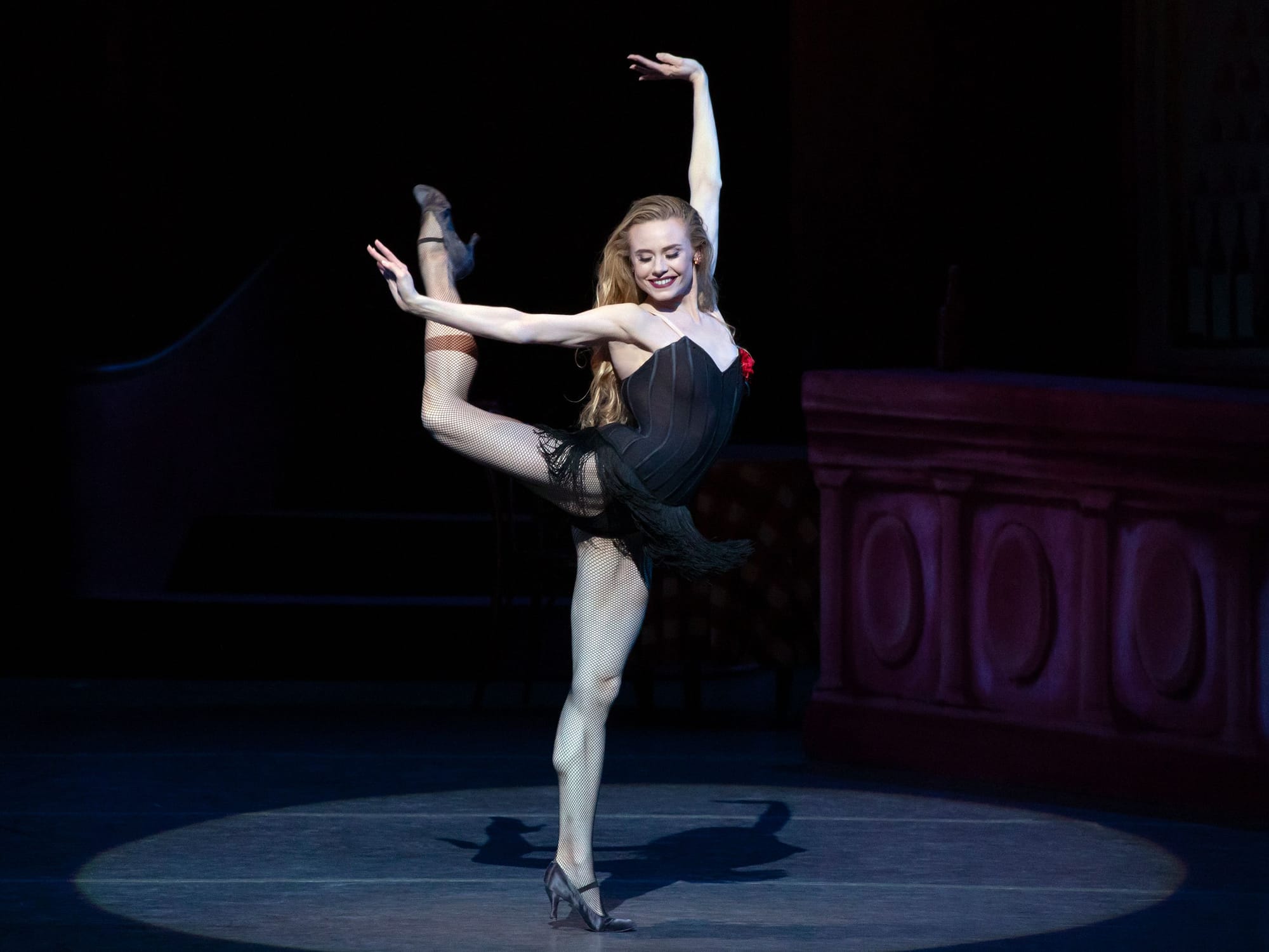 There were a number of debuts in the strikingly varied all-Balanchine program which started with “Bourree Fantasque” a light-hearted and rarely seen bonne bouche, followed by the rigorous black and white “Agon” and ended with a trip to Broadway in “Slaughter on Tenth Avenue”. “Bourree Fantasque”, choreographed in 1949 to music by the French Romantic Emmanuel Chabrier is a somewhat uneasy mixture of comedy, romance, and virtuosity, as if the commedia dell'arte dancers of “Dances Concertantes” decided to crash the party that the “La Valse” dancers were having and turn it into a fun free-for-all. It has chic but somewhat dated costumes by Karinska; the men all wear black berets, looking like animated advertisements for Gauloises and the women carry fans and wear long black lace gloves and either short fluffy tutus or pale Romantic skirts with an overlay of black lace, so redolent of the New Look.