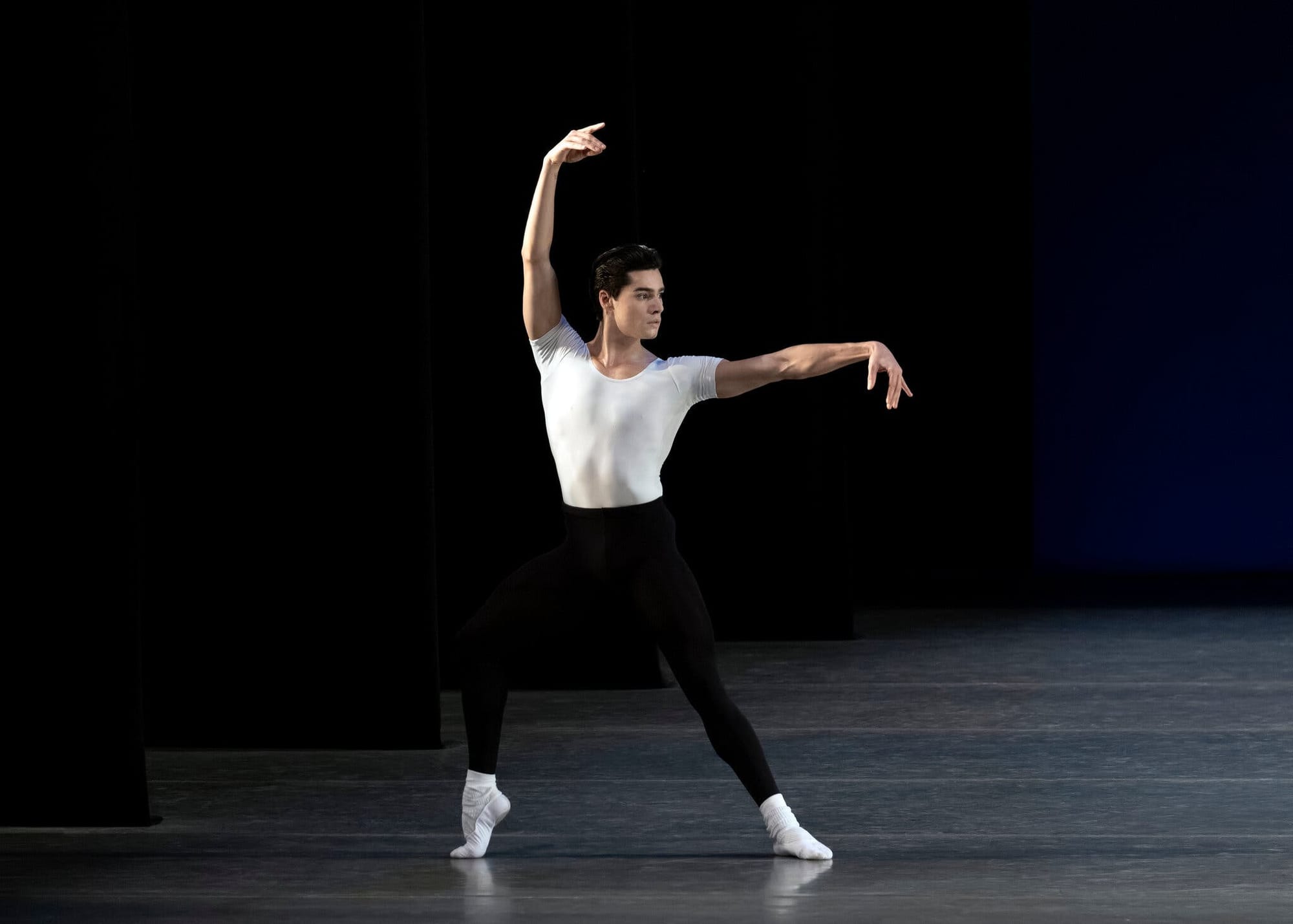 This section had yet another man (Gilbert Bolden III) yearning for a woman (Emilie Gerrity, another debut), this time without comedy. Bolden had a soft, romantic presence, as he walked through the group of women, searching without seeing. Gerrity emerged from the group and they danced a lush, gentle pas de deux where they echoed each other’s moves before they again disappeared for him, and both walked slowly off in different directions, as the corps formed yet more beautiful geometric patterns. Bolden was an exemplary partner, as he caught Gerrity in several mid-turns to let her show off her luxurious extensions. Gerrity also got to show off her gorgeous arabesque; it was beautifully danced but with experience she may be able to give it a richer perfume.