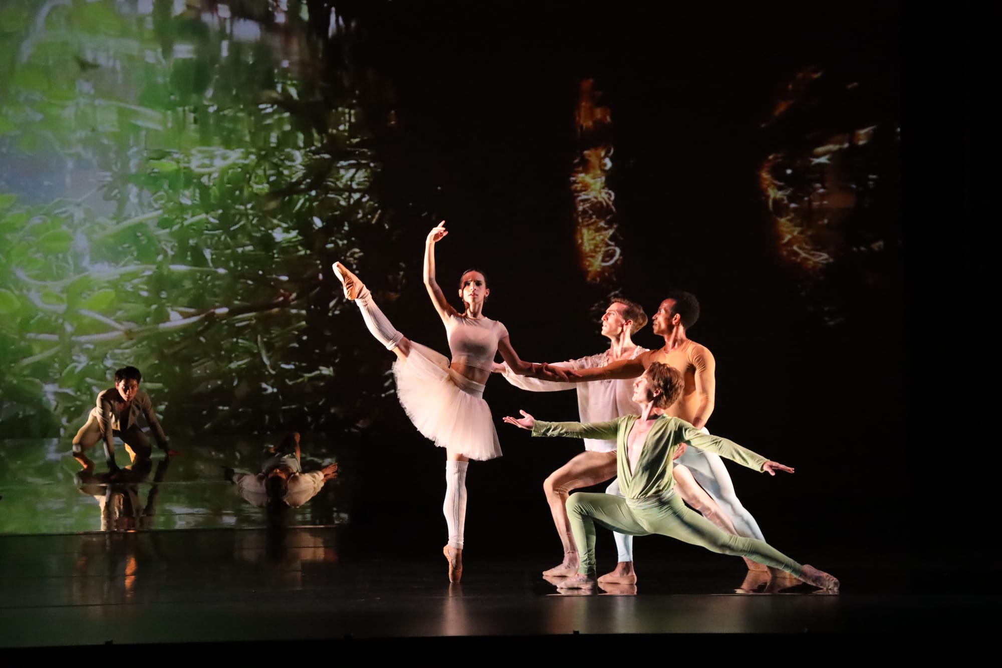 There was no bowing in Jessica Lang's "Shades of Spring", a youthful scamper through Haydn piano trios (recorded by the Beaux Arts Trio) for seven dancers dressed in stylized practice clothes and framed by large projections of roots, branches, and flowers; Roxane Devon did the visual art and projection design.